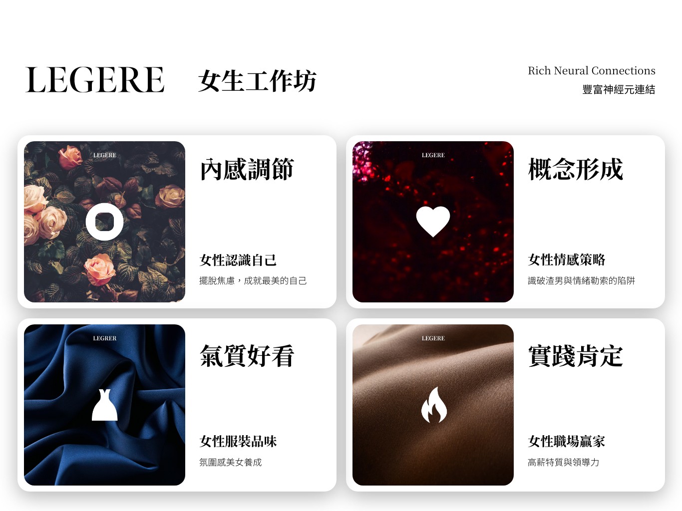 加入女性限定工作坊,讓妳掌握這四大部曲,成為人人稱羨的女性,獲得豐富的神經元連結、親密的伴侶關係、高薪的職涯路徑、優質的人脈和開心的生活。