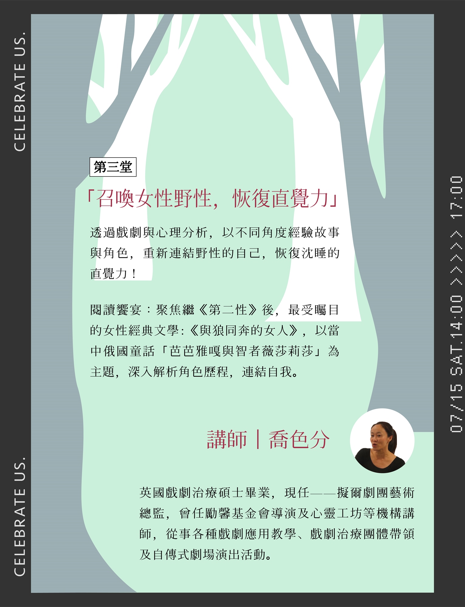 以戲劇出發,透過瑜珈舒展、即興探索、朗讀共感、直覺力培養等主題,與妳一同放鬆、充電,探索女性的多樣意識與原生力量,從文學與彼此之間發現共鳴與啟發。