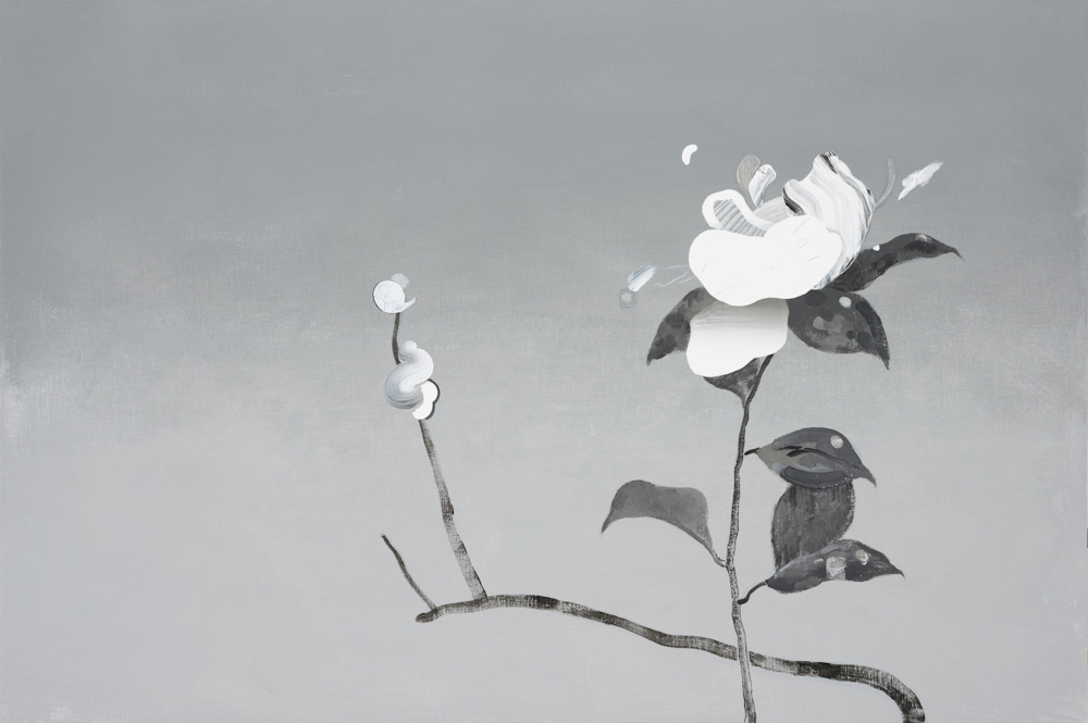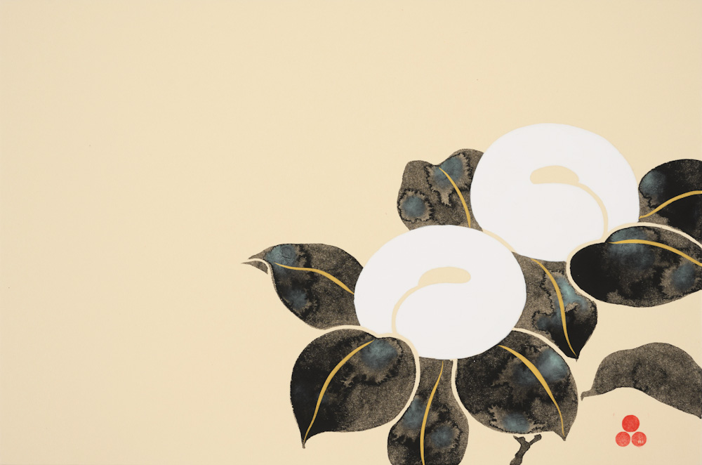 品川亮,白椿,2023,墨、胡粉、牛膠、金泥/紙,25 x 37.5 cm