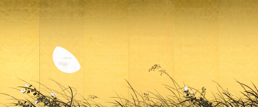 品川亮,秋草圖,2023,天然礦物顏料、墨、壓克力顏料、金箔、牛膠/紙,164 x 375 cm,set of 6