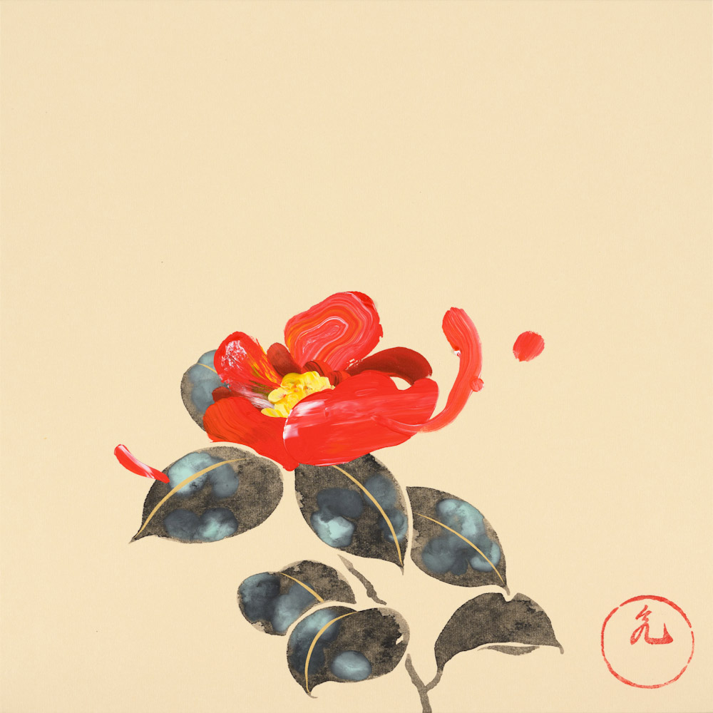 品川亮,雪椿,2023,天然礦物顏料、墨、壓克力顏料、金泥/紙,30 x 30 cm