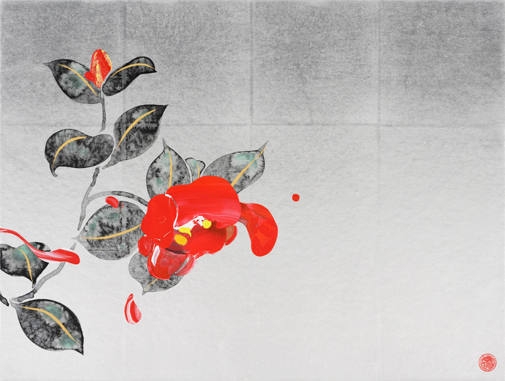 品川亮,雪椿,2023,天然礦物顏料、銀箔、墨、壓克力顏料、金泥、牛膠/紙,37.5 x 49.5 cm