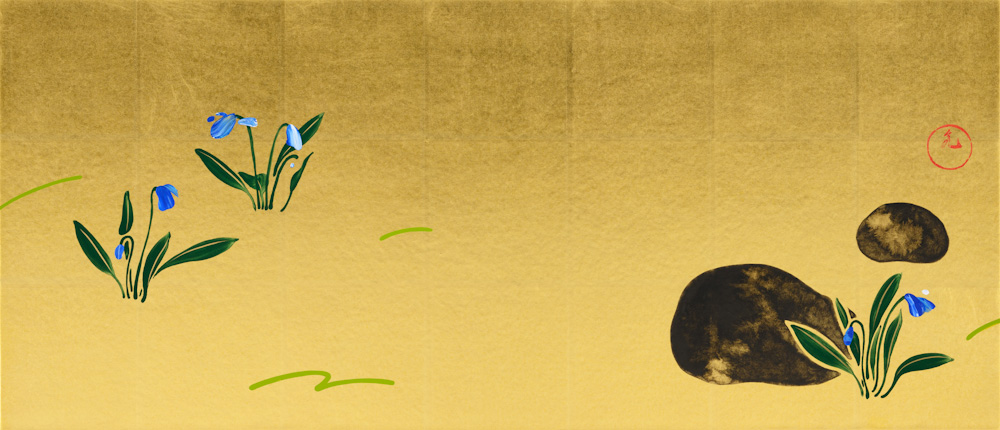 品川亮,菊圖,2023,天然礦物顏料、墨、壓克力顏料、金箔、牛膠/紙,50 x 75 cm