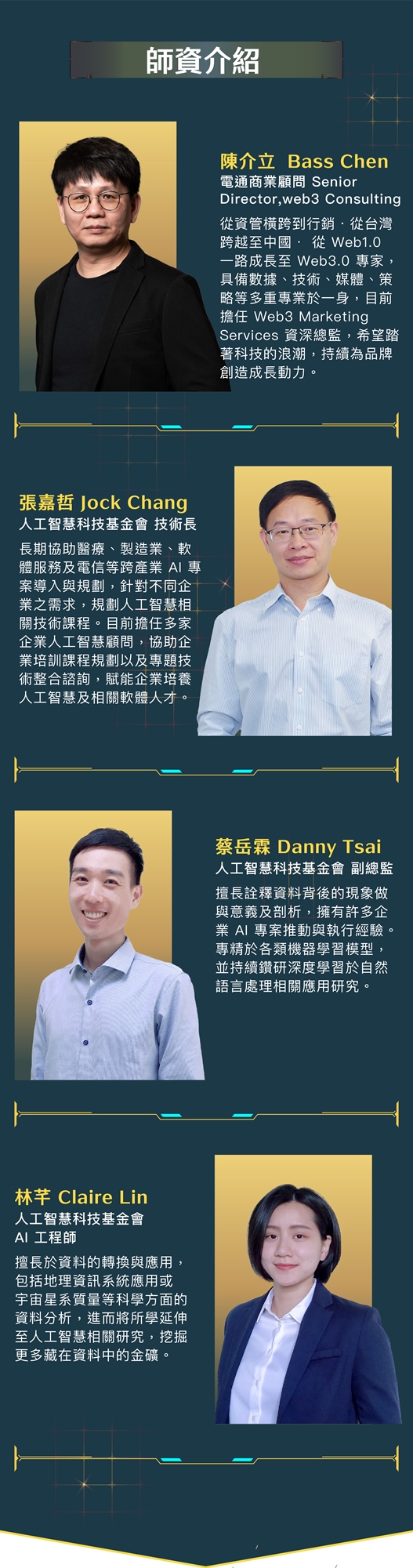 以促進產業之人工智慧科技提升、應用發展及社會永續為宗旨,以客製化訓練、知識推廣及專案服務,賦能企業建立自己的 AI 團隊,發揮既有優勢、提升價值並促進轉型。