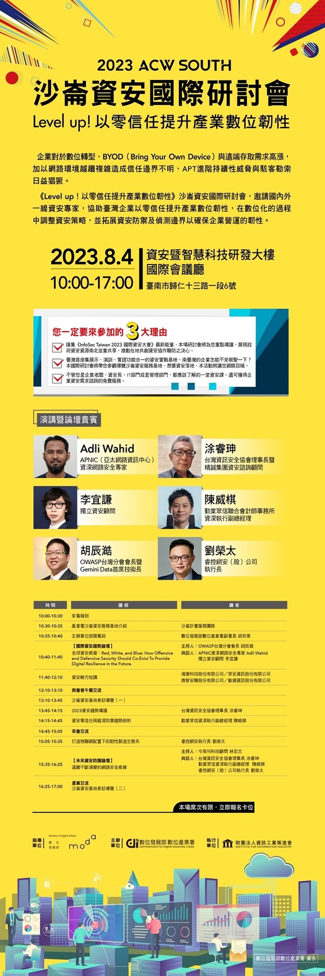《Level up!以零信任提升產業數位韌性》沙崙資安國際研討會,邀請國內外一線資安專家,協助臺灣企業以零信任提升產業數位韌性,在數位化的過程中調整資安策略,並拓展資安防禦及偵測邊界以確保企業營運的韌性。