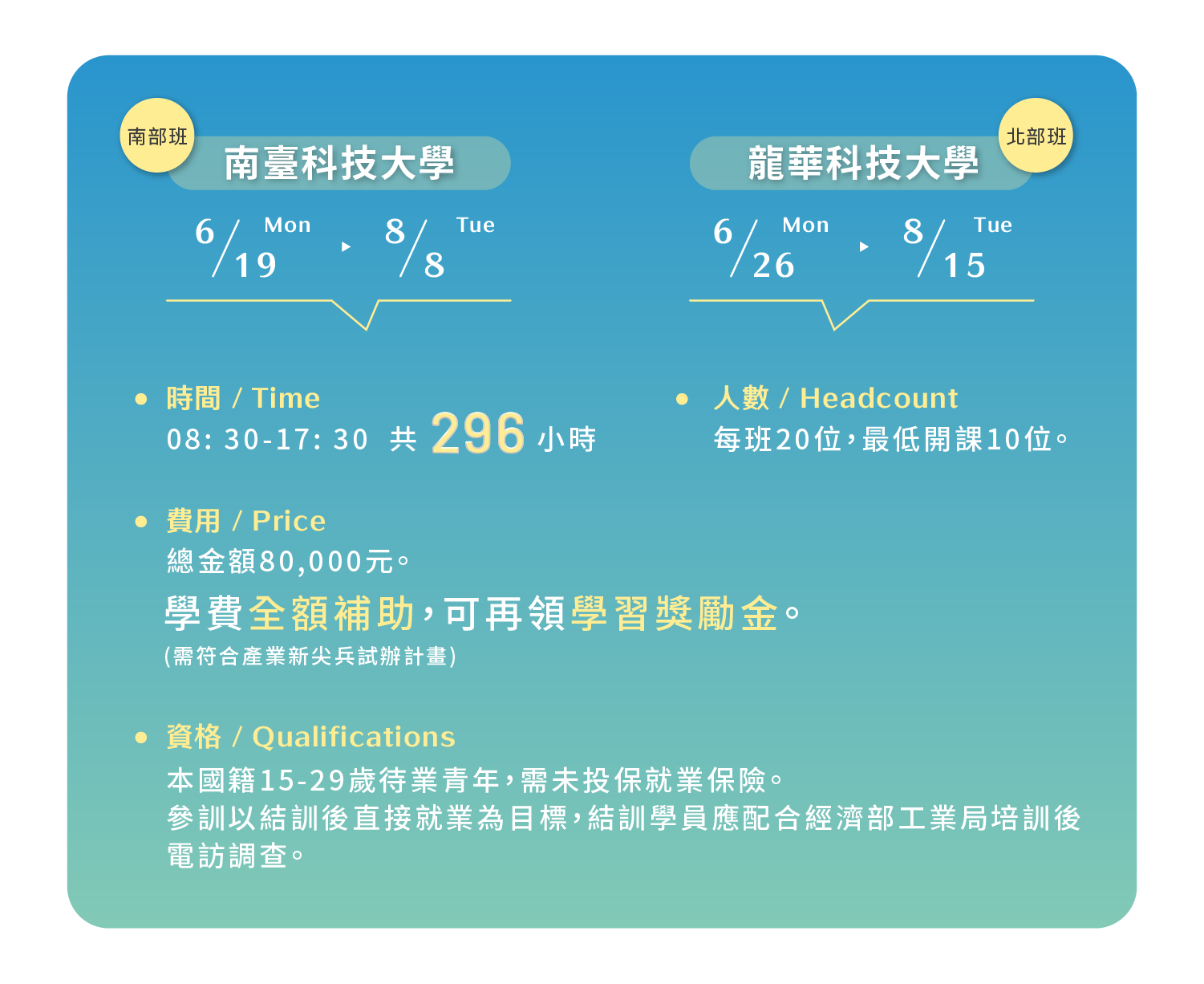 ※退訓規則:曠課時數超過課程總時數三分之一,培訓期間不得具勞工保險(不含訓字保)、就業保險身分,或為營利事業登記負責人,一經查驗一律退訓並取消上課資格。