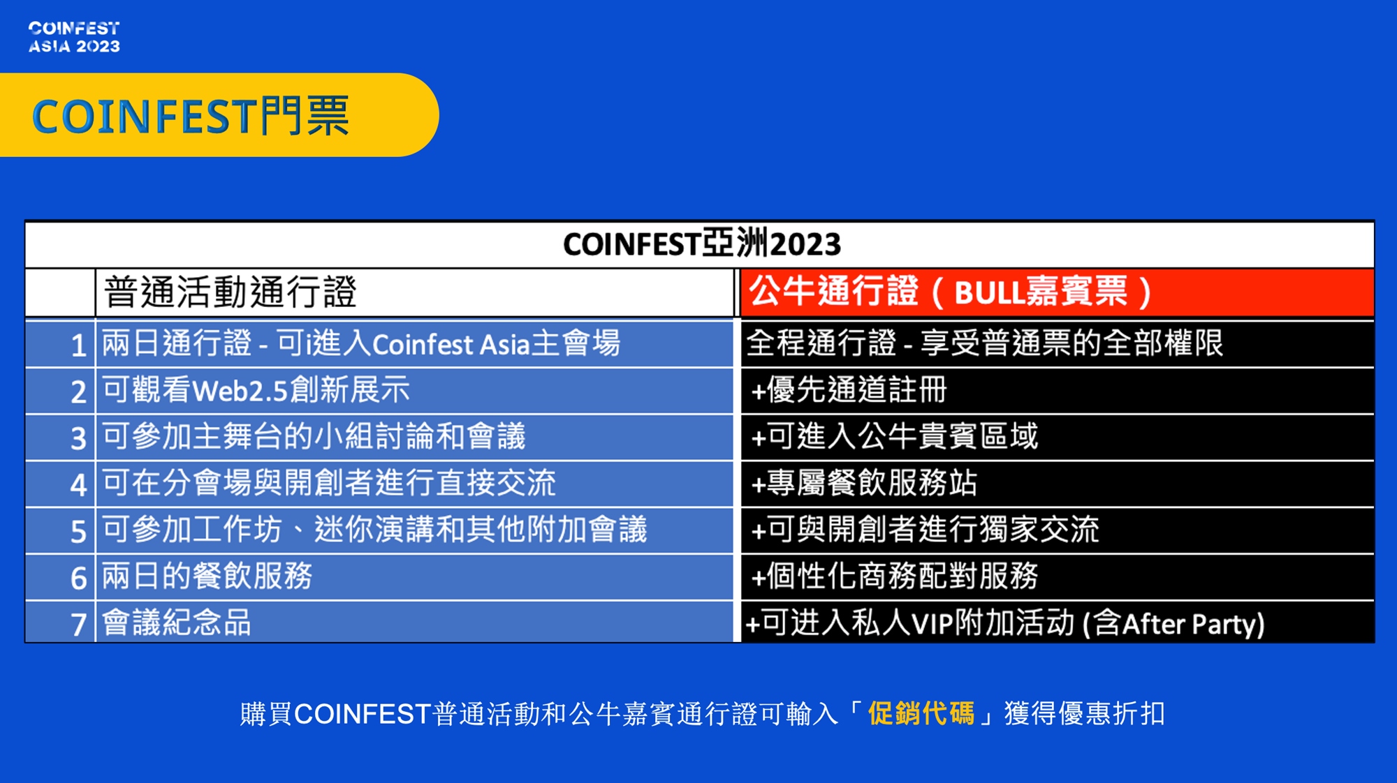 ※Festival Ticket 票價包含:Coinfest Asia主會場 2日通行證乙張、2天餐飲服務、會議紀念品乙份、訪問 Web2.5 創新展示、進入主舞台的小組討論和會議