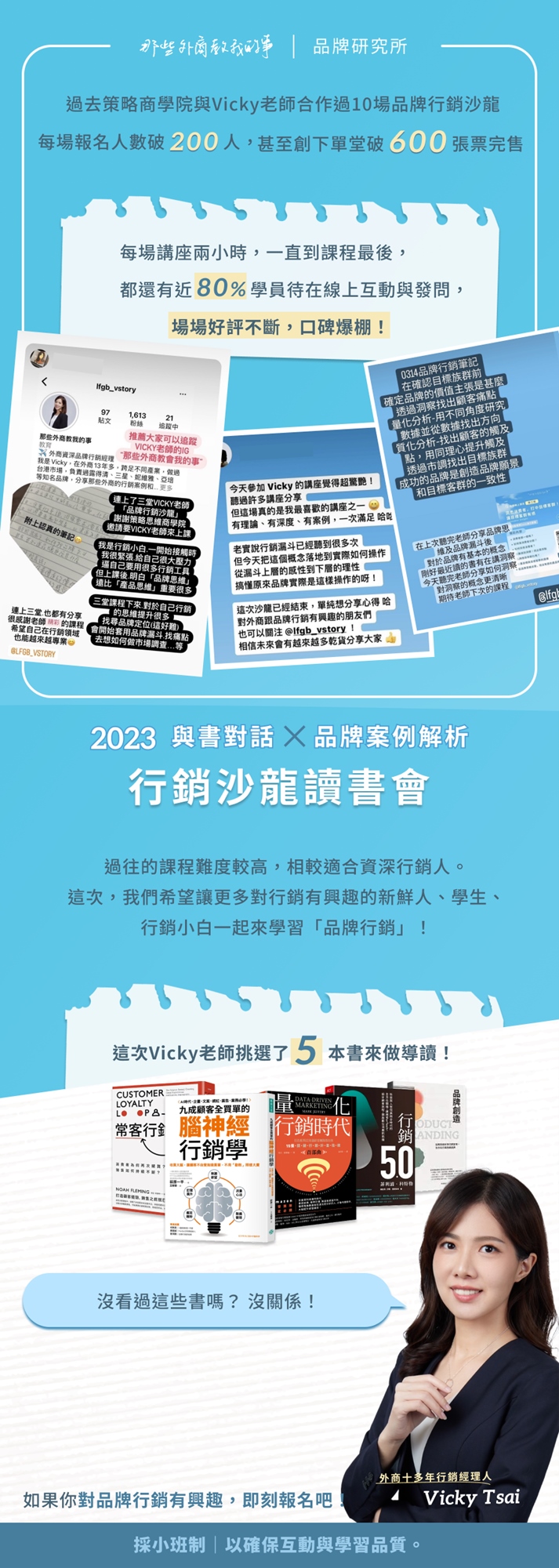 所以,Vicky老師特地挑了這五本書來做導讀與重點整理,當然也都會搭配品牌行銷實際案例的分享,讓參與的學員們,能從個案與討論中,更了解品牌行銷的精髓與心法。