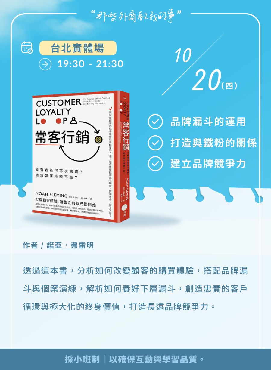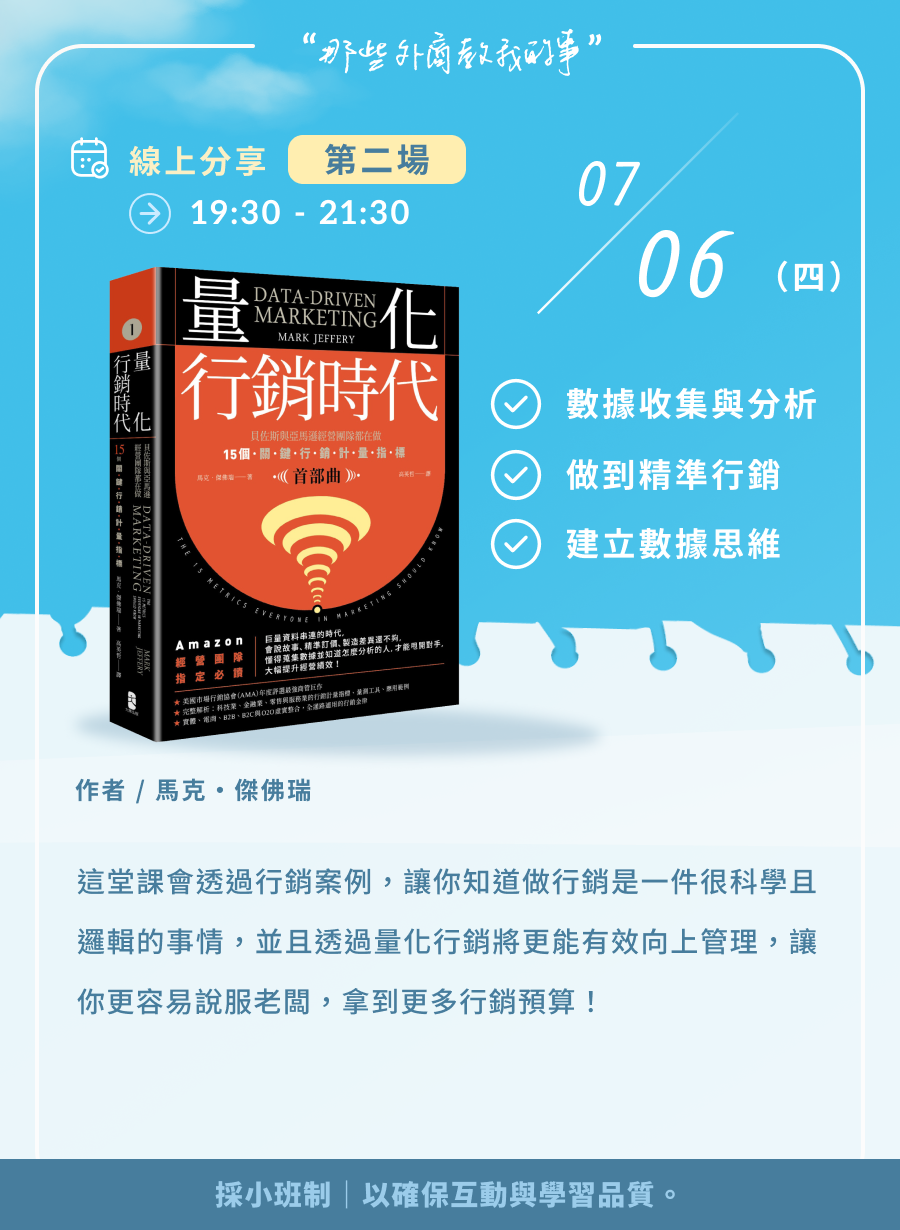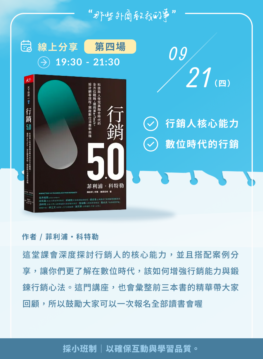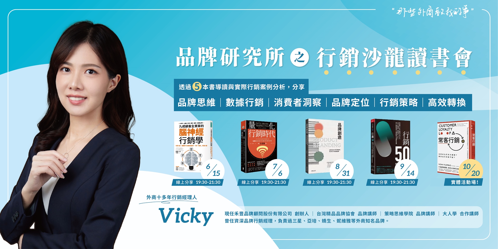 Vicky老師將透過行銷大師《行銷5.0》,深度探討行銷人必備的核心能力:資料行銷、敏捷行銷、預測行銷、場景行銷與增強行銷,並且搭配不同的行銷案例分享,讓參與學員們更了解在數位時代,該如何運用MarTech,該如何增強行銷能力與鍛鍊行銷心法,好因應不斷變化的科技與潮流。這門講座,也會彙整前三本書的精華,再一次帶大家回顧「消費者洞察」、「數據思維的量化行銷」、「品牌定位的行銷策略」,所以鼓勵大家可以一次報名全部讀書會喔~