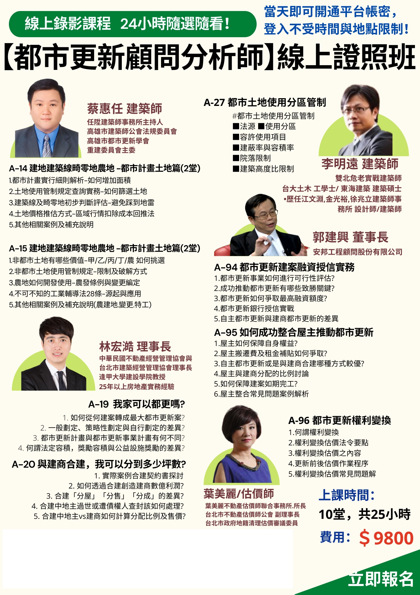 【線上課程】都市更新顧問分析師證照班,線上價9800元!完款當天立即開通!