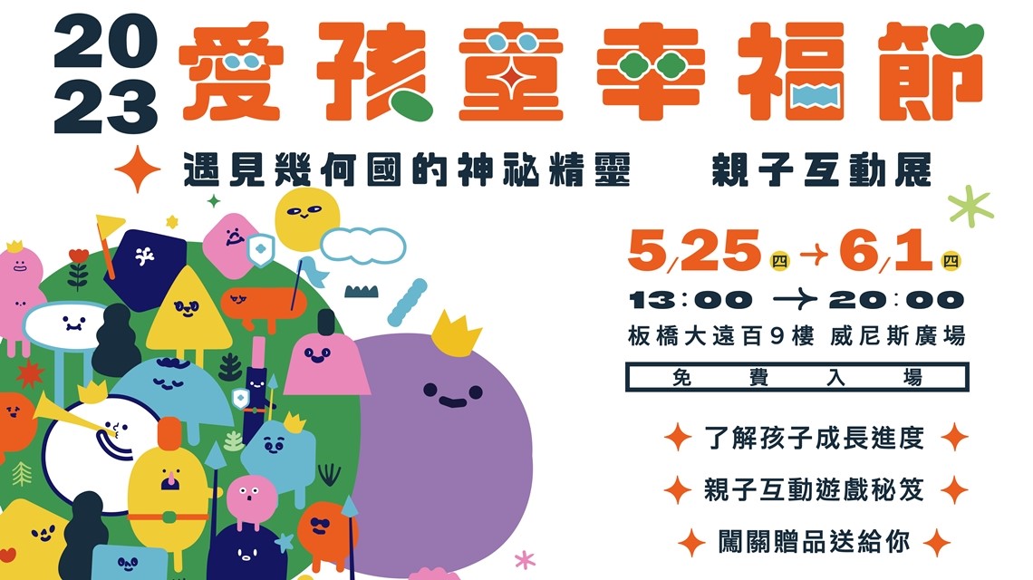 以「遇見幾何國的神祕精靈」為主題,結合了幾何圖形、顏色、空間等元素,透過親子互動體驗關卡,讓民眾從遊戲的過程中了解慢飛天使、偏鄉學童在成長、學習中所遇到的困境,也能在遊戲中,增進親子關係,邀請父母帶著家中的小孩們,一同參加台北場愛孩童幸福節,完成體驗關卡後,還有小禮物等你拿。