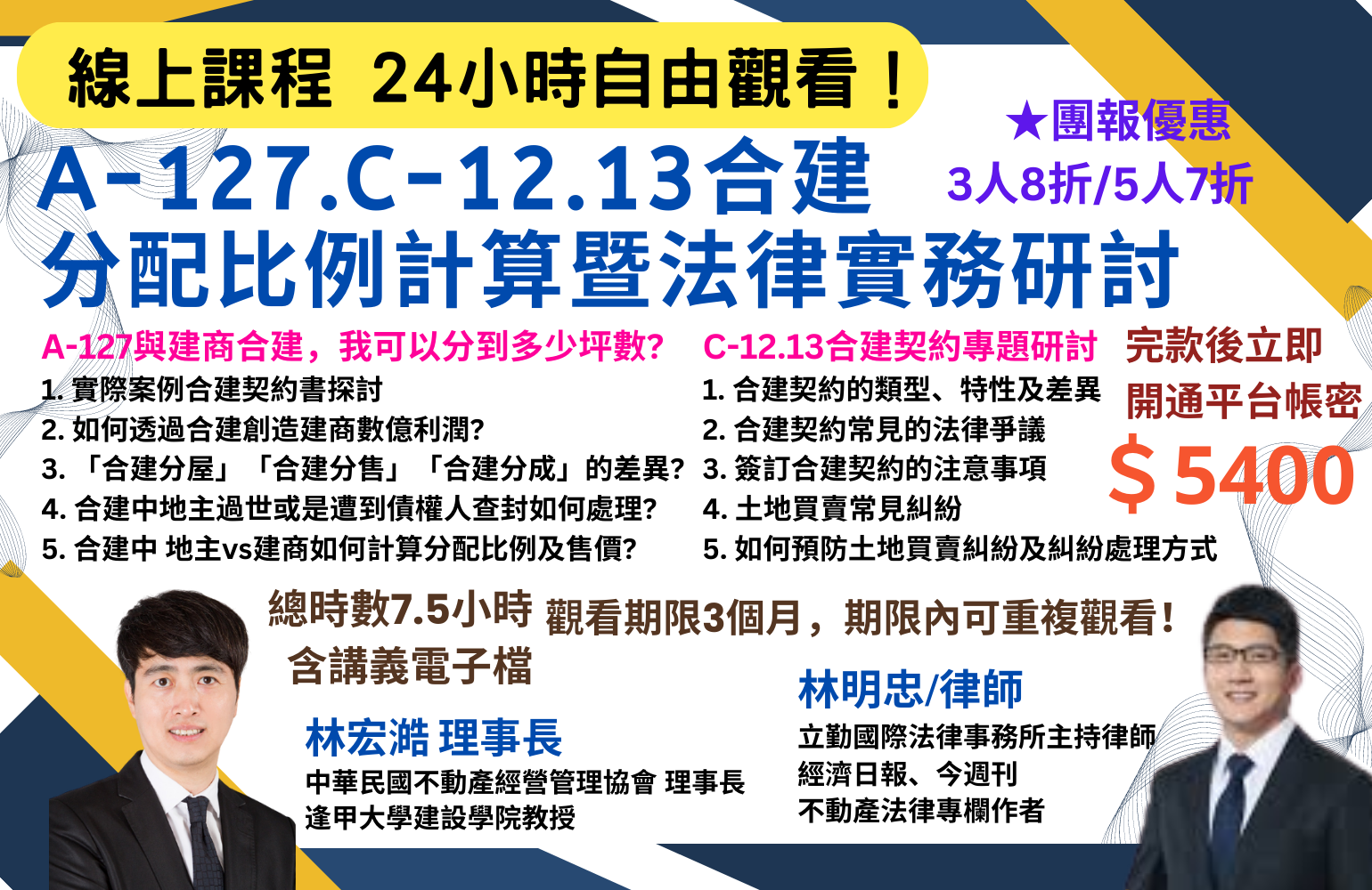 【線上課程】合建分配比例計算暨法律實務研討,線上價5400元!完款當天立即開通!
