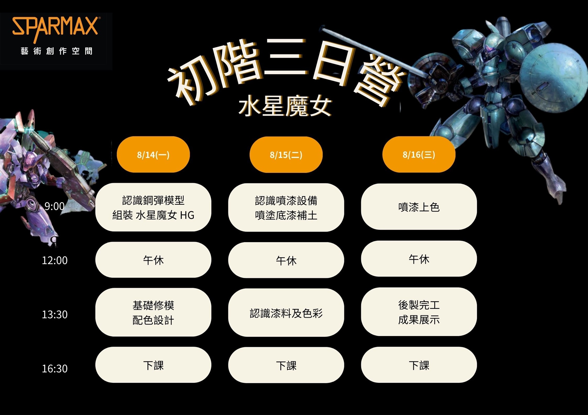 - 課程費用:6500元/人,包含課程使用 水星的魔女 HG 1/144 組裝模型 一個,課程使用漆料與畫筆。