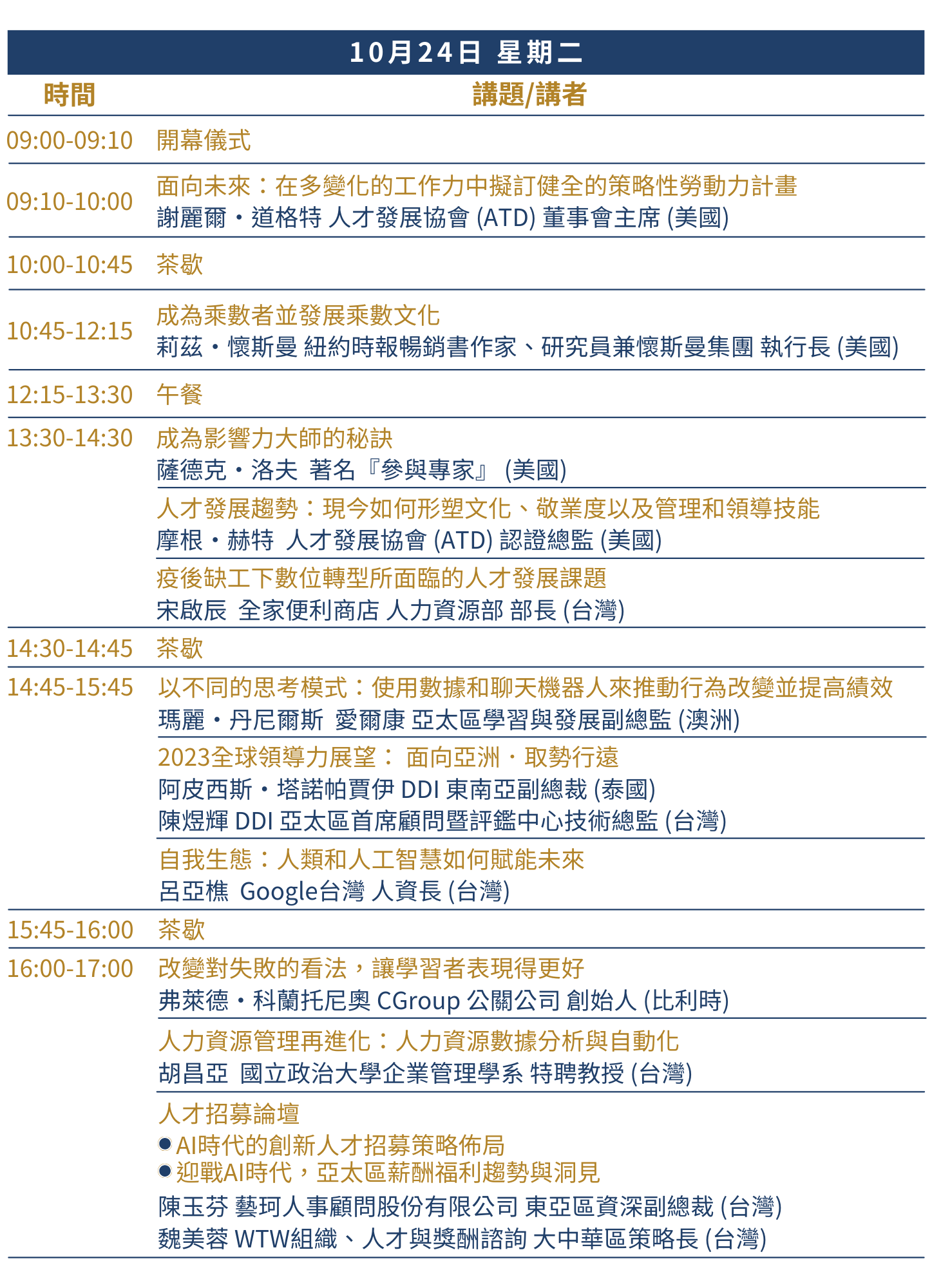 ATD亞太年會已歷經11年不斷進步,作為亞太區首屈一指的人力資源和商務菁英參與的年度大會。 2023年ATD亞太年會暨展覽邁入第12屆,今年將主題定為:「預見未來:打造新時代工作力」,以世界上最創新的人才發展解決方案作為標竿,同業夥伴建立人脈網絡,向全球思維領導者直接學習為宗旨。預計有5場主題演講、31場專題演講、14展商發表會及6場主題交流會,提供更多優質演說內容及互動交流,呈現人才發展在實踐高效變革管理,及組織韌性實務作法之中扮演的重要角色。