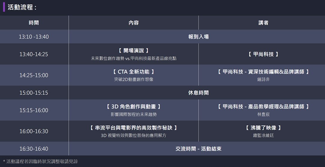 同時,也敬邀媒體朋友參加,甲尚科技為亞洲唯一業務行銷全球的動畫軟體與平台公司,期待為台灣虛擬數位世界科技進步、自媒體科技未來、動畫人才培育貢獻並分享給更多需要的人,了解甲尚科技踏足國際的行銷成功案例以及獨家技術!