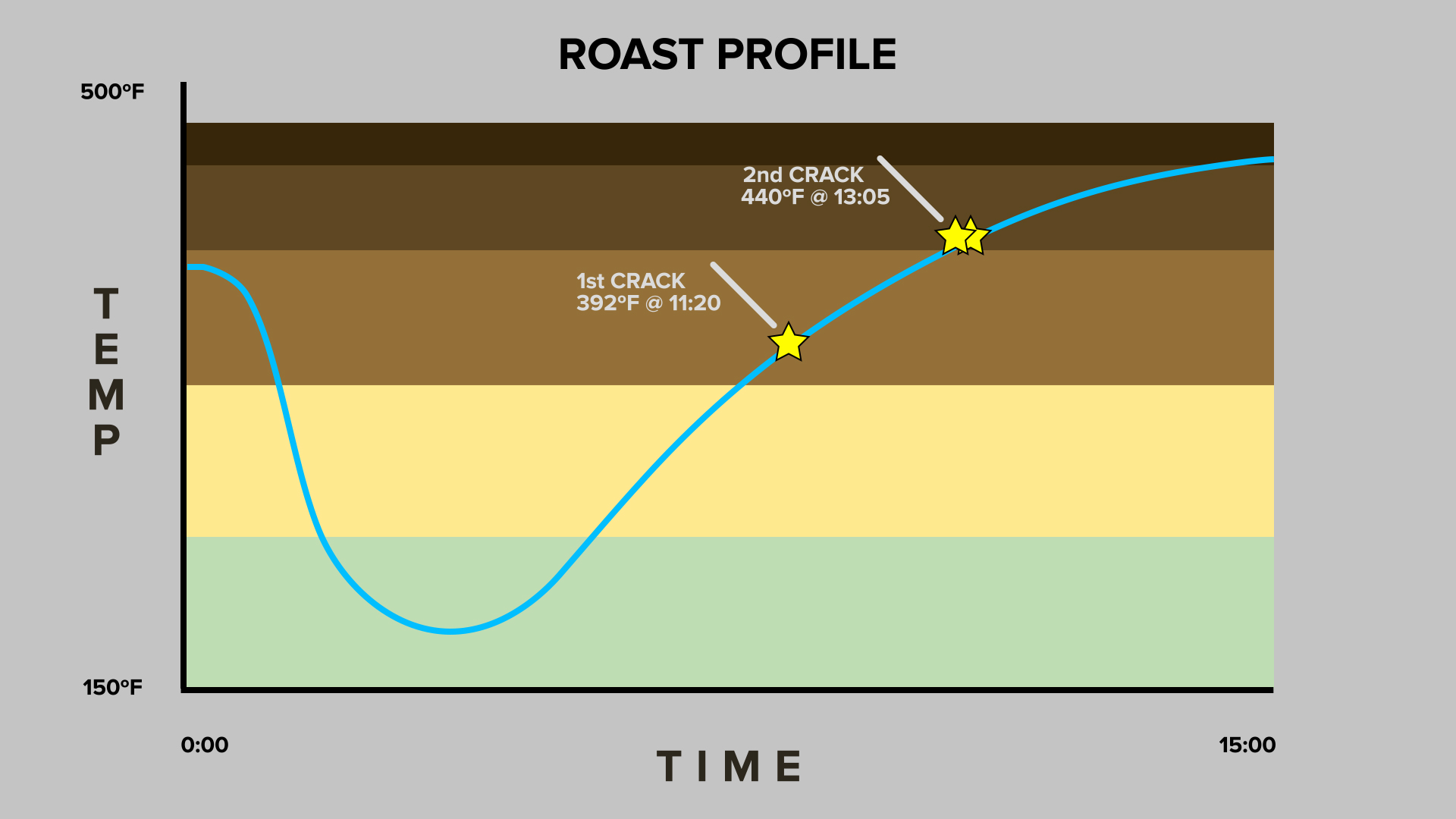 (圖說:上圖為咖啡烘焙時建議的溫控曲線,通常在一爆(1st CRACK)及二爆(2nd CRACK)之間下豆)