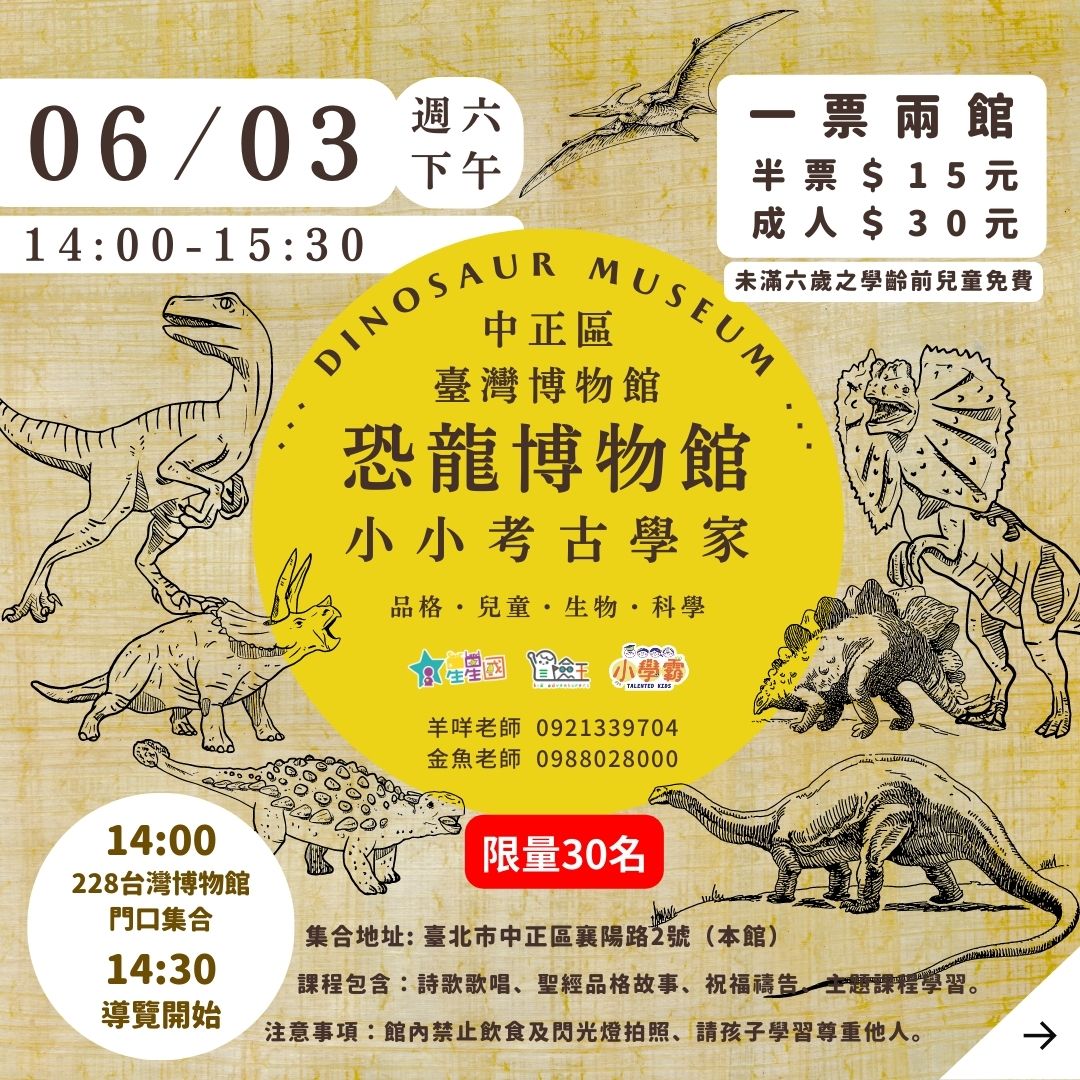 以孩子們最愛的恐龍時代為題,與考古學家一起穿越時空來到中生代的地球,一窺神創造中生代時的天地,透過考古的一二手資料揭開恐龍的神秘面紗。讓各個小小恐龍考古學家們能有一個交流溝通的時刻,彼此分享自己最愛的恐龍與最新發現吧 :)