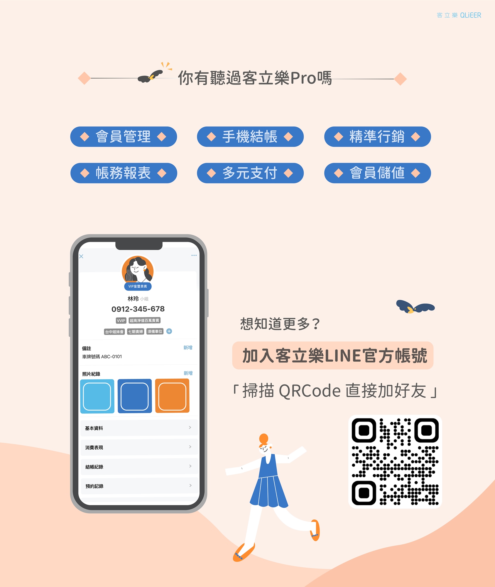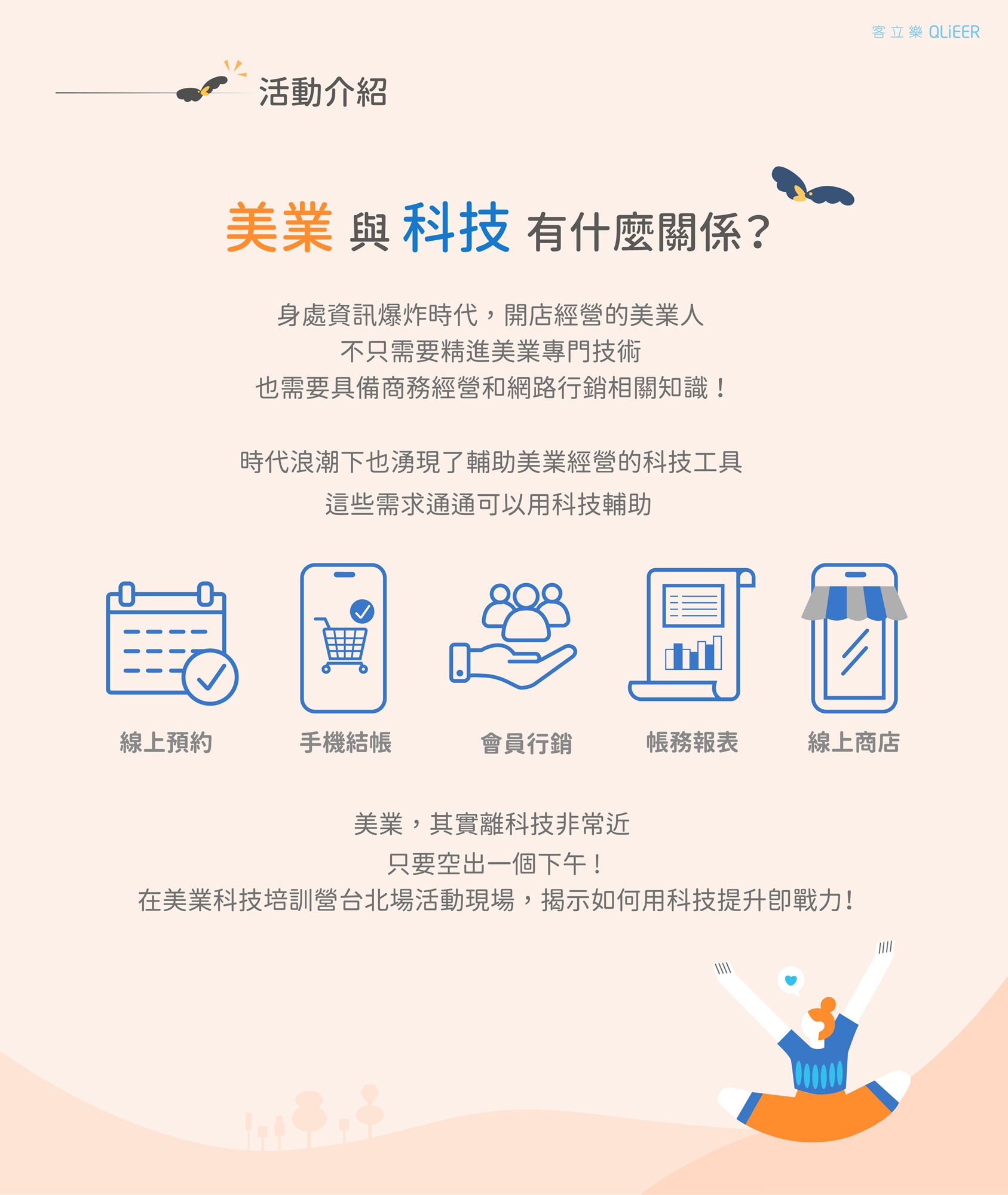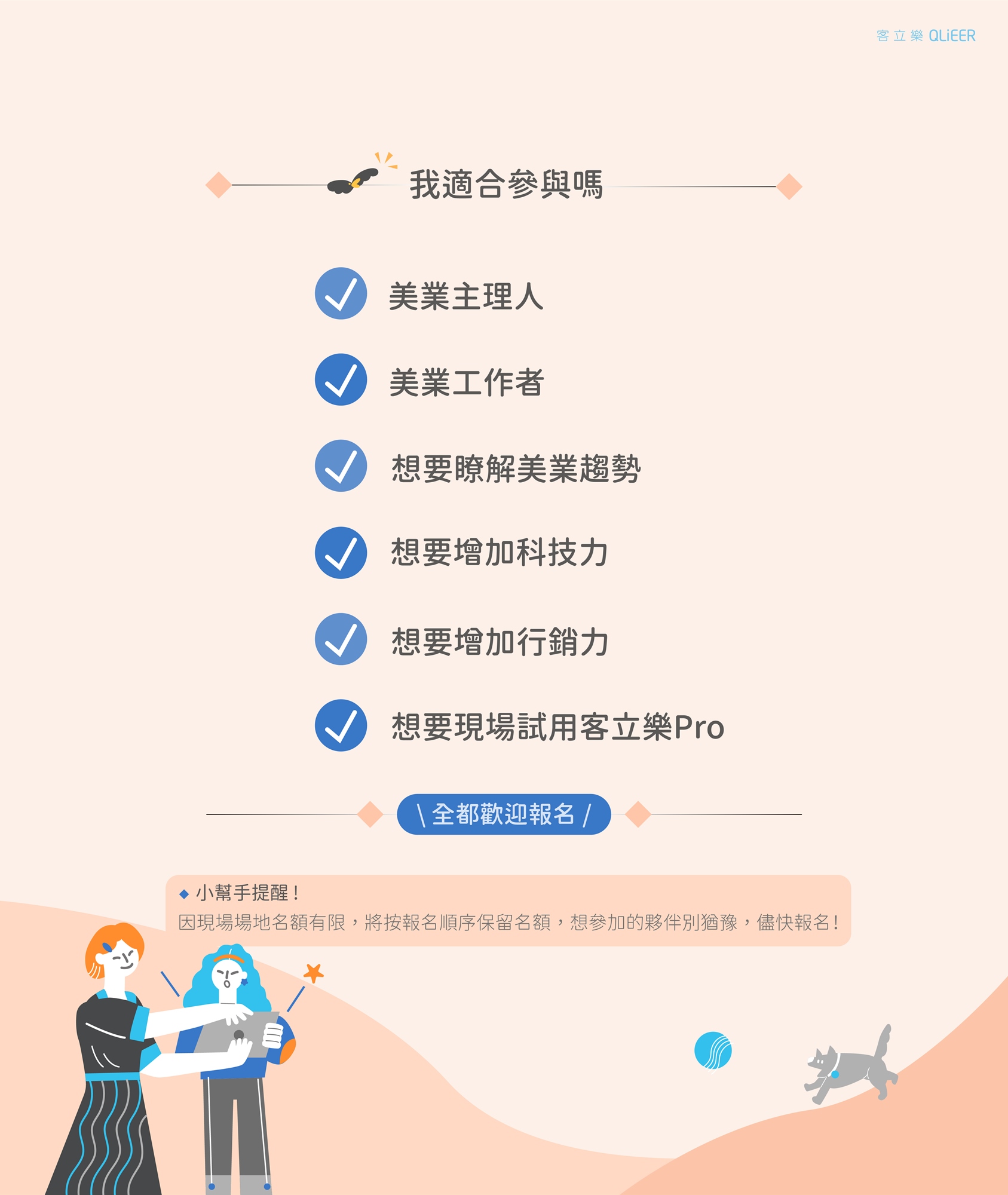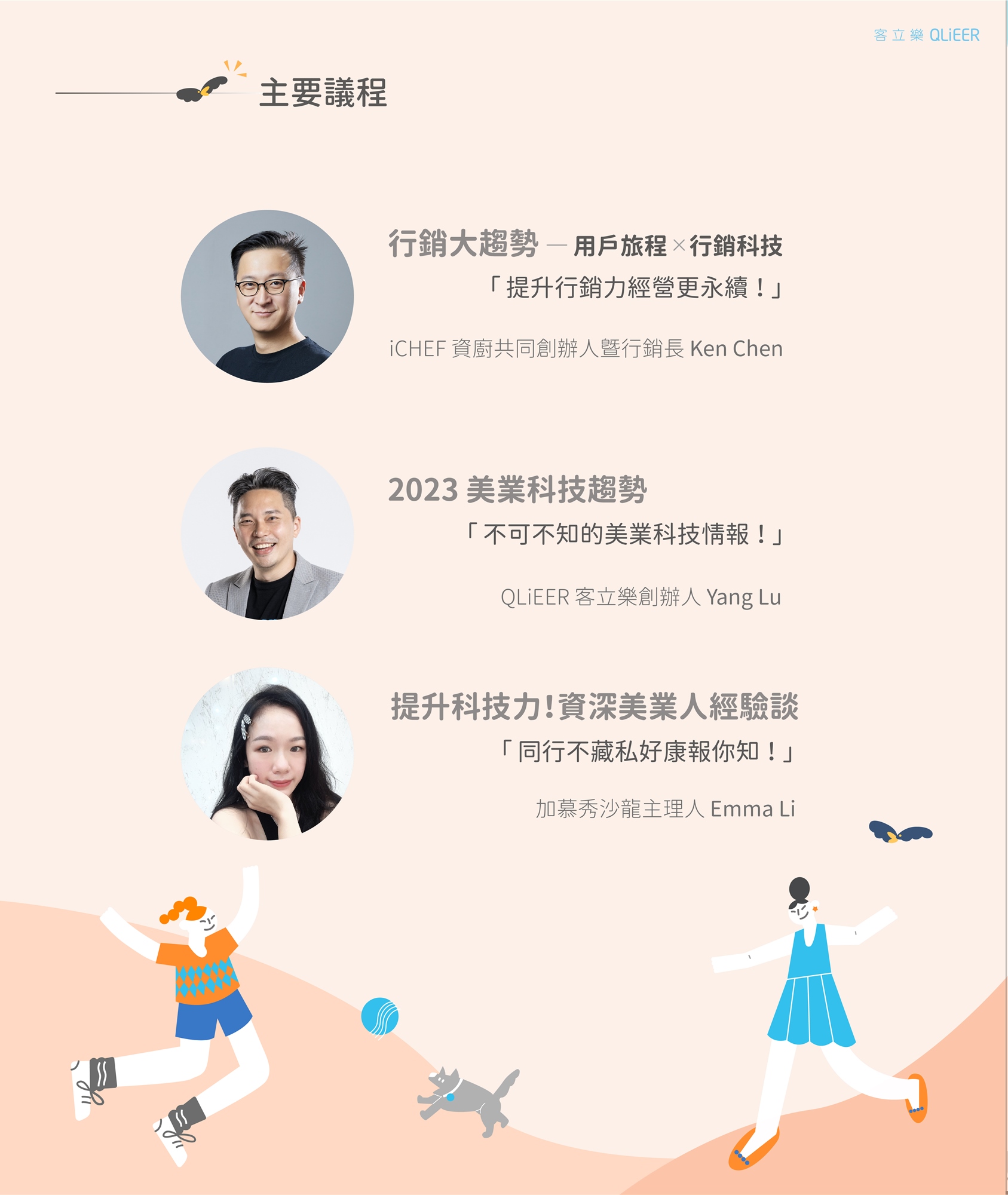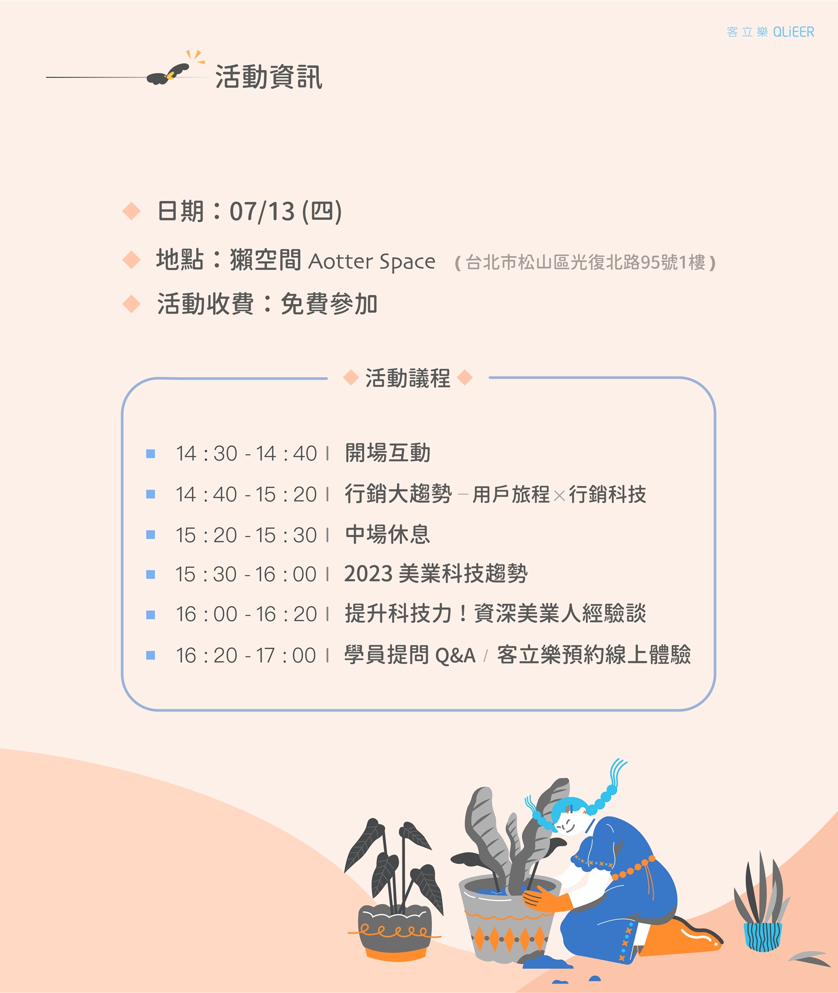 美業 vs 科技有什麼關係? 客立樂免費美業科技講座用一個下午告訴你! 7/13(四) 在台北獺空間,特別邀請iCHEF 資廚共同創辦人暨行銷長 Ken Chen 及 QLiEER 客立樂創辦人 Yang Lu,深入介紹 2023 年度行銷與科技趨勢,帶領美業人領略用戶旅程及經營奧秘。特別邀請資深主理人 加慕秀沙龍主理人Emma Li ,不藏私分享如何提升科技力。還有機會現場試用美業預約APP「客立樂Pro」!