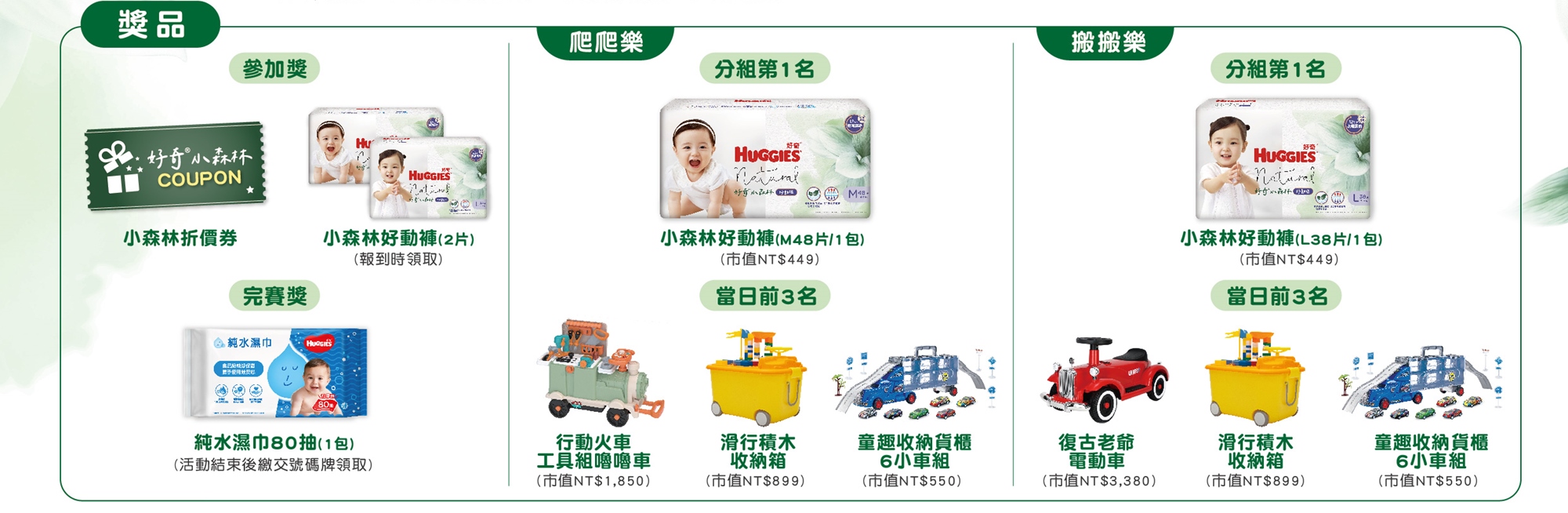 2.每組限時2分鐘,參賽寶寶需於時間內將好奇尿布從起點線搬到終點線,每回合時 間到即進行尿布包數統計,包數最多者獲勝。