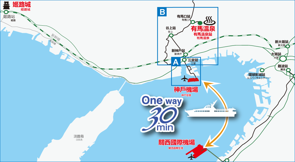 - 搭乘高速船自神戶機場至關西機場,下船后乘聯運巴士可依次抵達第一航站樓和第二航站樓。