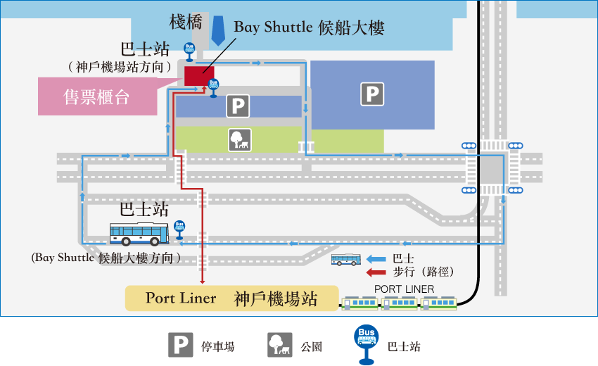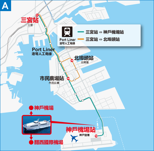 搭乘路線:關西機場Bay Shuttle售票處購票→12號巴士站乘聯運巴士(5分)→機場乘船碼頭→高速船(30分)→神戶機場碼頭(巴士或步行到對面的神戶機場站)→搭乘PORT LINER到神戶三宮