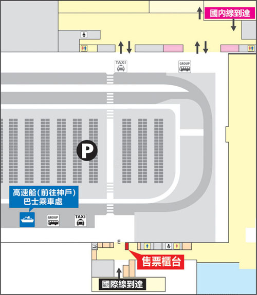 第1候機樓 售票廳 →12號巴士站轉坐免費巴士(5分鐘)→碼頭→高速船(30分鐘)→神戶