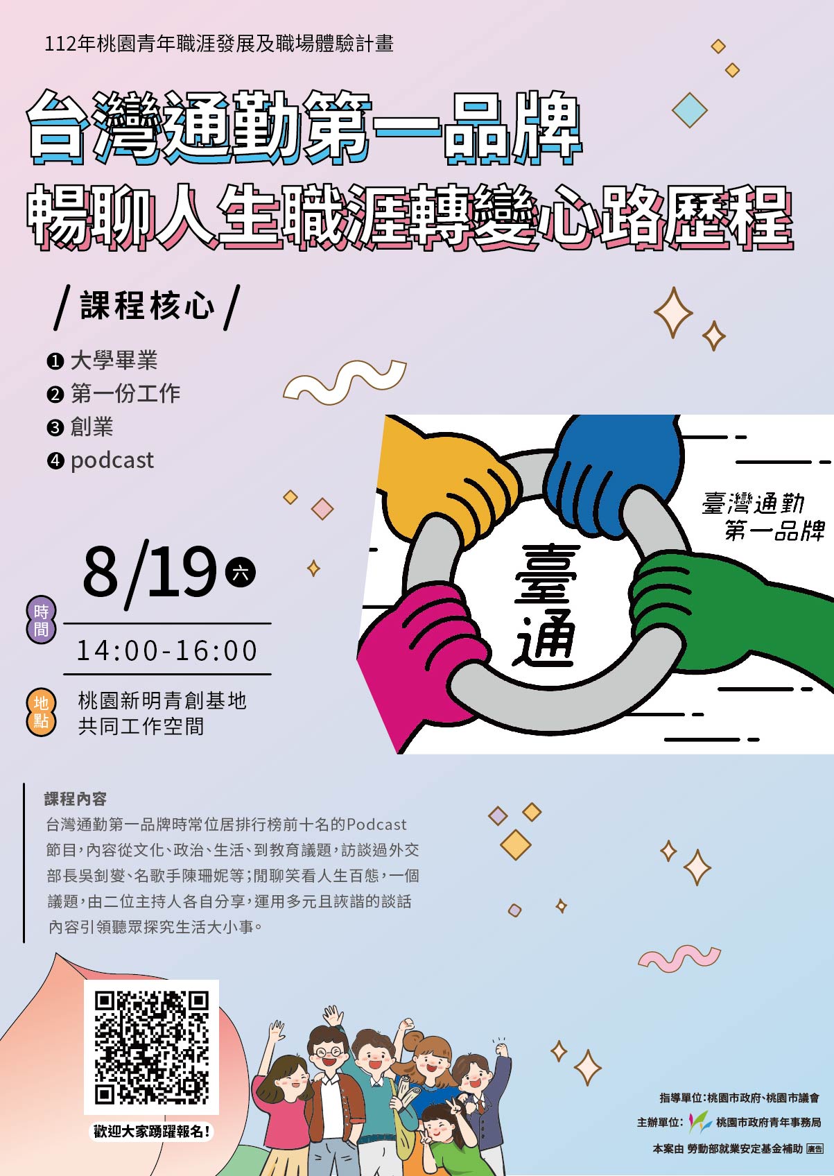 「台灣通勤第一品牌」透過Podcast節目引領聽眾探究生活大小事,本次講座跟你一起暢聊人生職涯轉變心路歷程,快來報名~
