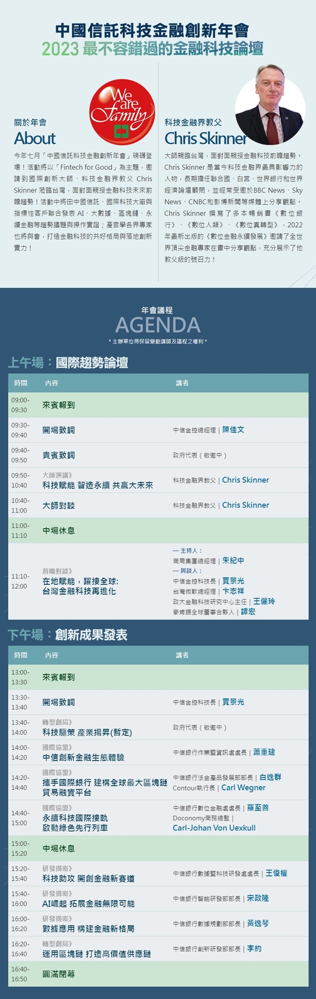 「中國信託科技金融創新年會」磅礡登場!活動將以「Fintech for Good」為主題,邀請到白宮、聯合國常任顧問,科技金融界教父 Chris Skinner 蒞臨台灣,面對面親授前瞻趨勢!活動中將由中國信託、國際科技大廠與指標性客戶聯合發表 AI、大數據、區塊鏈、永續金融等趨勢議題與操作實證,產官學各界專家也將與會,打造金融科技的共好格局與落地創新實力!