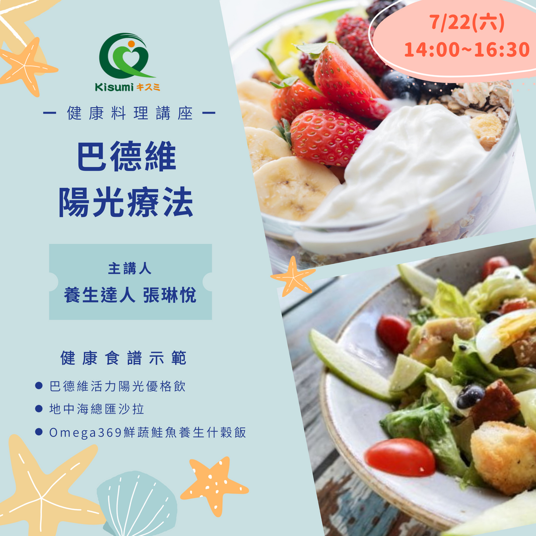 《Kisumi 心之美健康生活館》以「健康飲食」為主題,在新北市新莊區舉辦了健康又豐盛的體驗講座,教大家如何使用各種好油、好蜂蜜、好優格、好食材做出「巴德維陽光飲食」。這是一場讓你用心慢慢感受好食材的饗宴,吃進身體的東西好壞、只有身體最知道!現場將以PPT講述內容、親手手作、一起食用、一起聊聊天、一起討論心得...等等各種形式進行。
