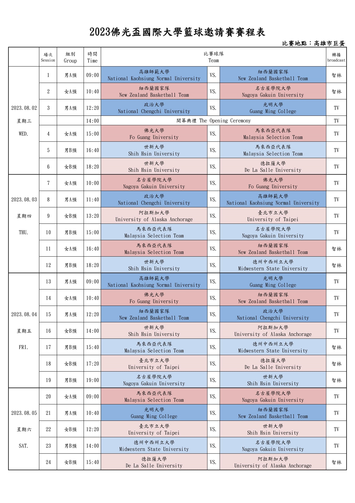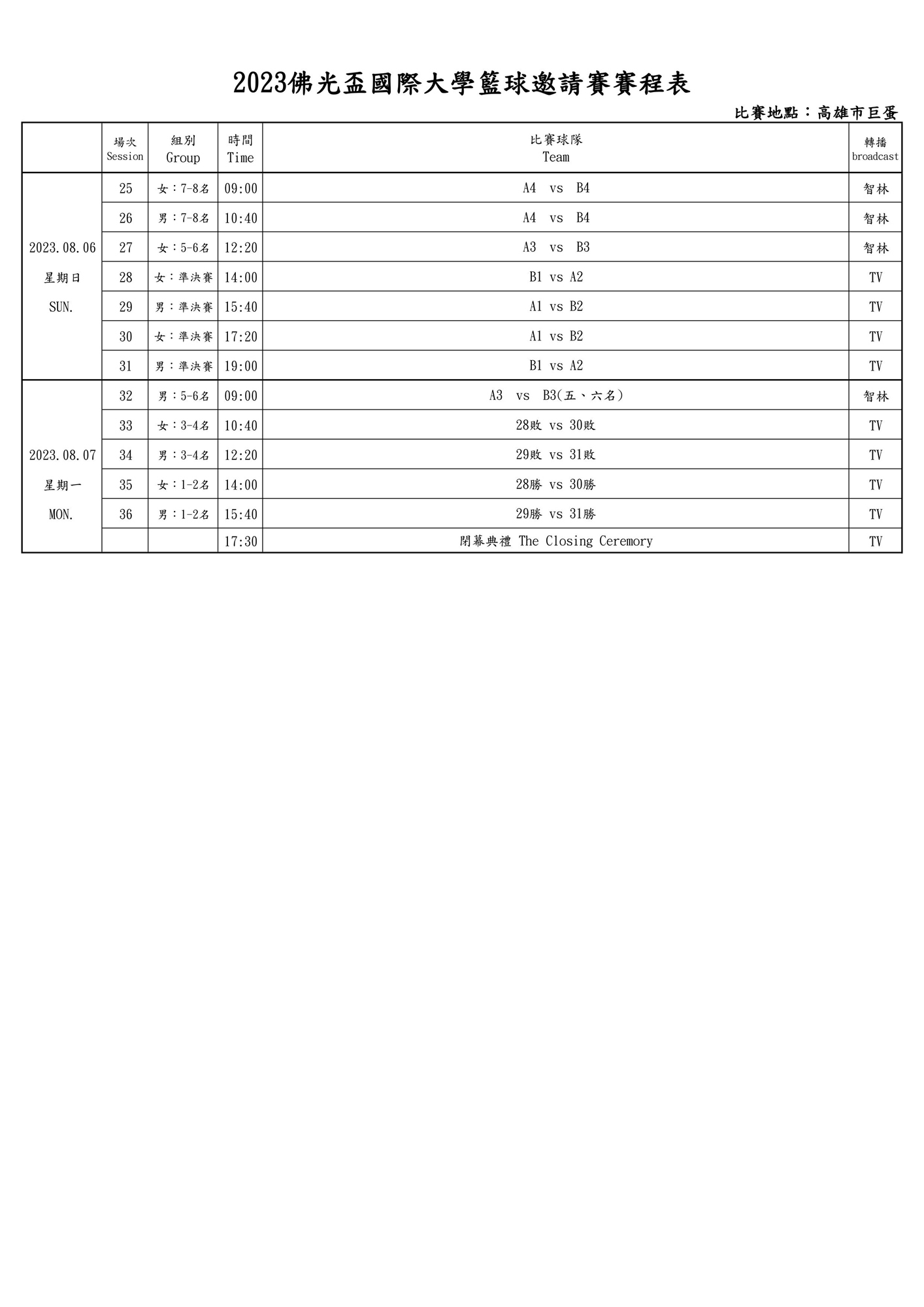 - 賽程表: