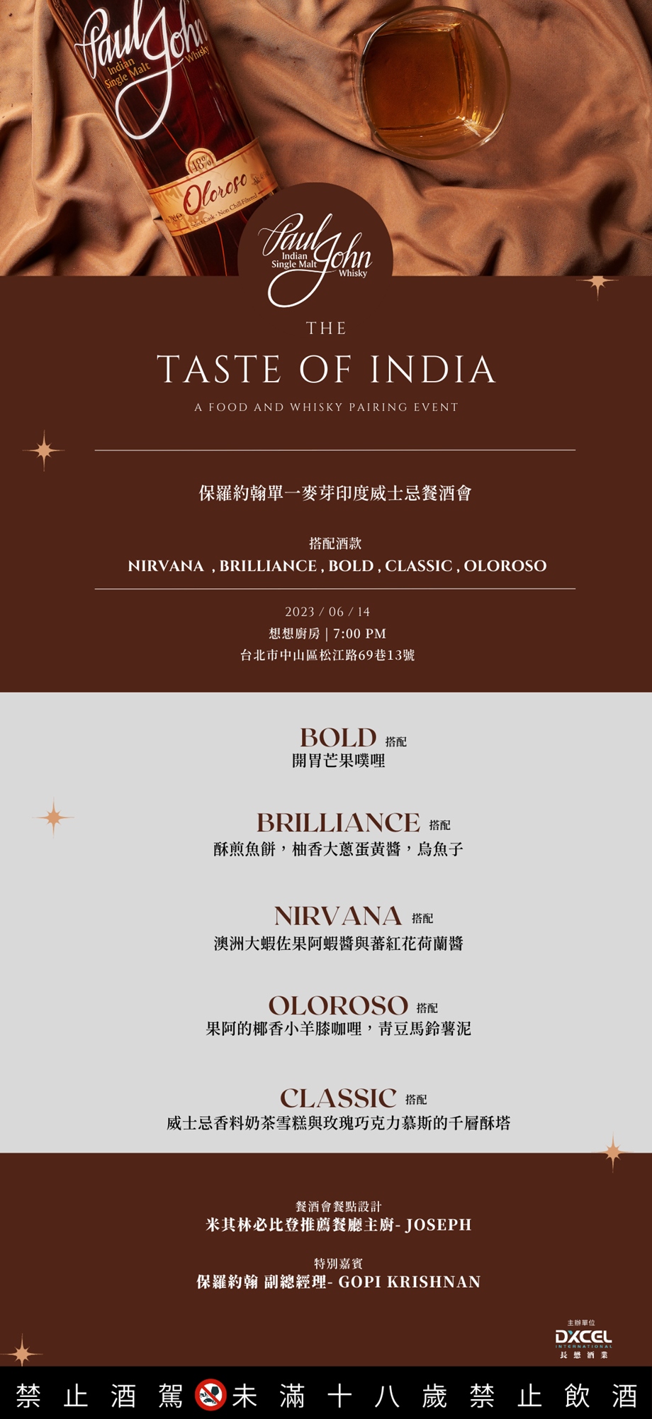 保羅約翰單一麥芽印度威士忌2023年在台首場餐酒會,由米其林必比登推薦餐廳主廚為您精心設計一場無與倫比的餐酒會。除了用餐時的威士忌品銘搭配,Joseph主廚更是將每一款威士忌都完美融合到印度的特色料理中,讓您享受餐酒會的極致體驗!