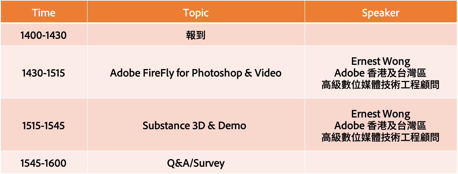 報到時請攜帶公司名片一張及出示電子票卷QR Code供工作人員掃瞄,若無出示電子票卷QR Code當天有可能無法或延誤入場,若未事先報名者Adobe保留最終進場決定權。