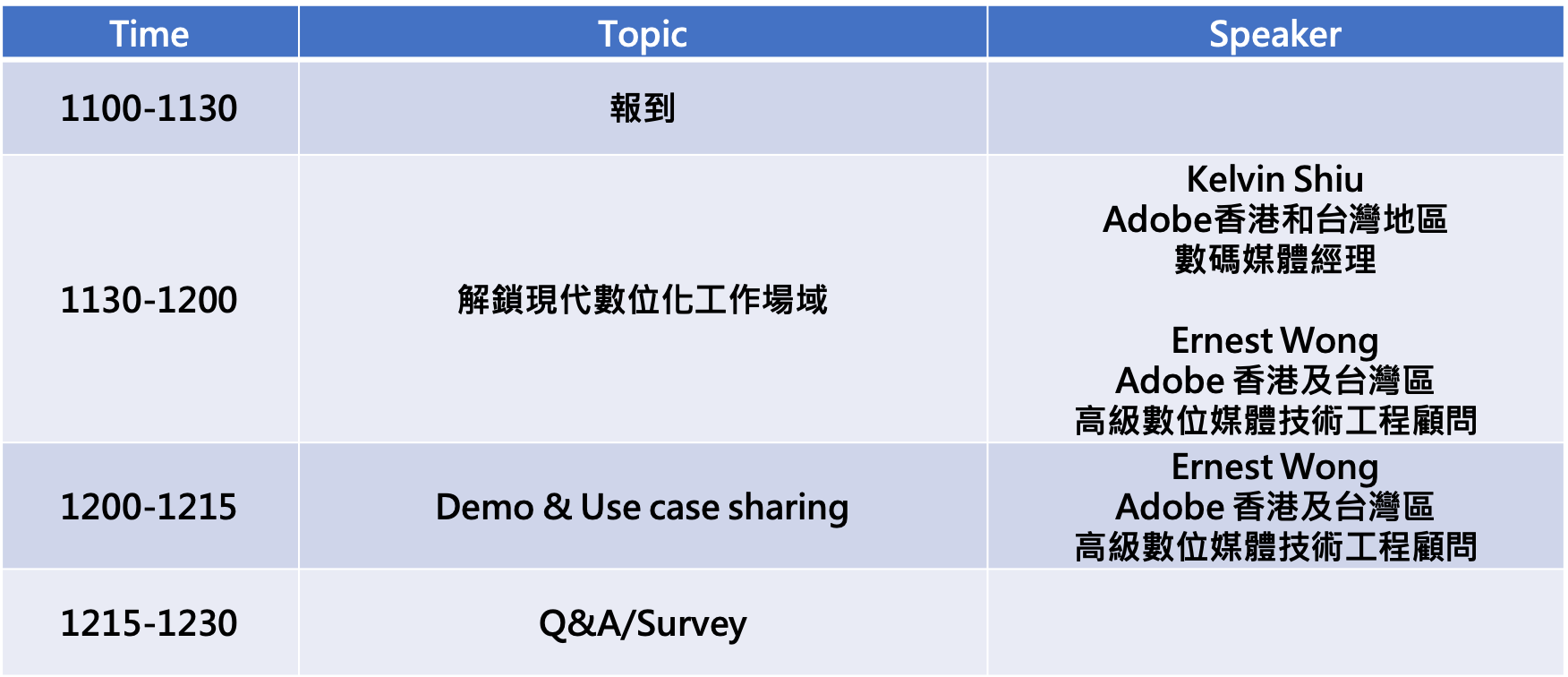 報到時請攜帶公司名片一張及出示電子票卷QR Code供工作人員掃瞄,若無出示電子票卷QR Code當天有可能無法或延誤入場,若未事先報名者Adobe保留最終進場決定權。