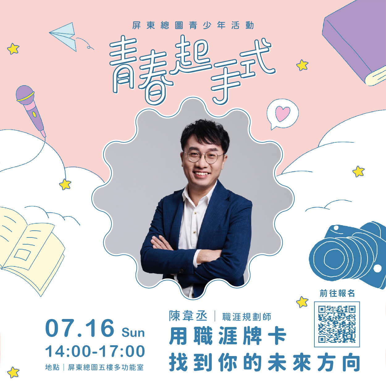 | 𝟕/𝟏𝟔 𝐒𝐮𝐧. 𝟏𝟒:𝟎𝟎-𝟏𝟕:𝟎𝟎 | 用職涯牌卡找到你的未來方向 | 陳韋丞 職涯規劃師 | 屏東總圖 五樓多功能室 |