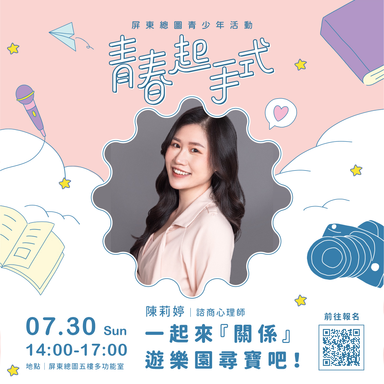 | 𝟕/𝟑𝟎 𝐒𝐮𝐧. 𝟏𝟒:𝟎𝟎-𝟏𝟕:𝟎𝟎 | 一起來『關係』遊樂園尋寶吧! | 陳莉婷 諮商心理師 |