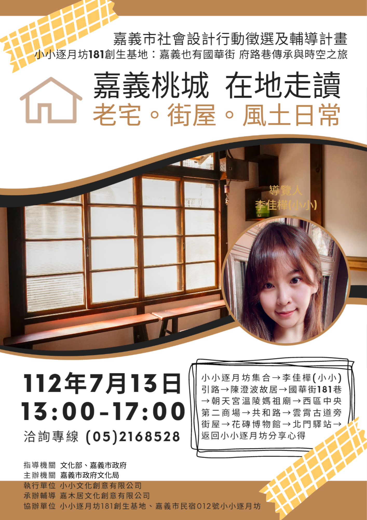 本次走讀路徑主題為「老宅街屋日常軌跡」為主,搭配藝文工作者李佳樺(小小)於活動正式進行之前,先與大家引路說明,接著陪伴大家沿途導覽,以深入淺出方式,走讀嘉義桃城人文風土與故事,全程分別以國語、臺語穿插說明,陪伴大家完成豐富有趣的走讀路徑活動。