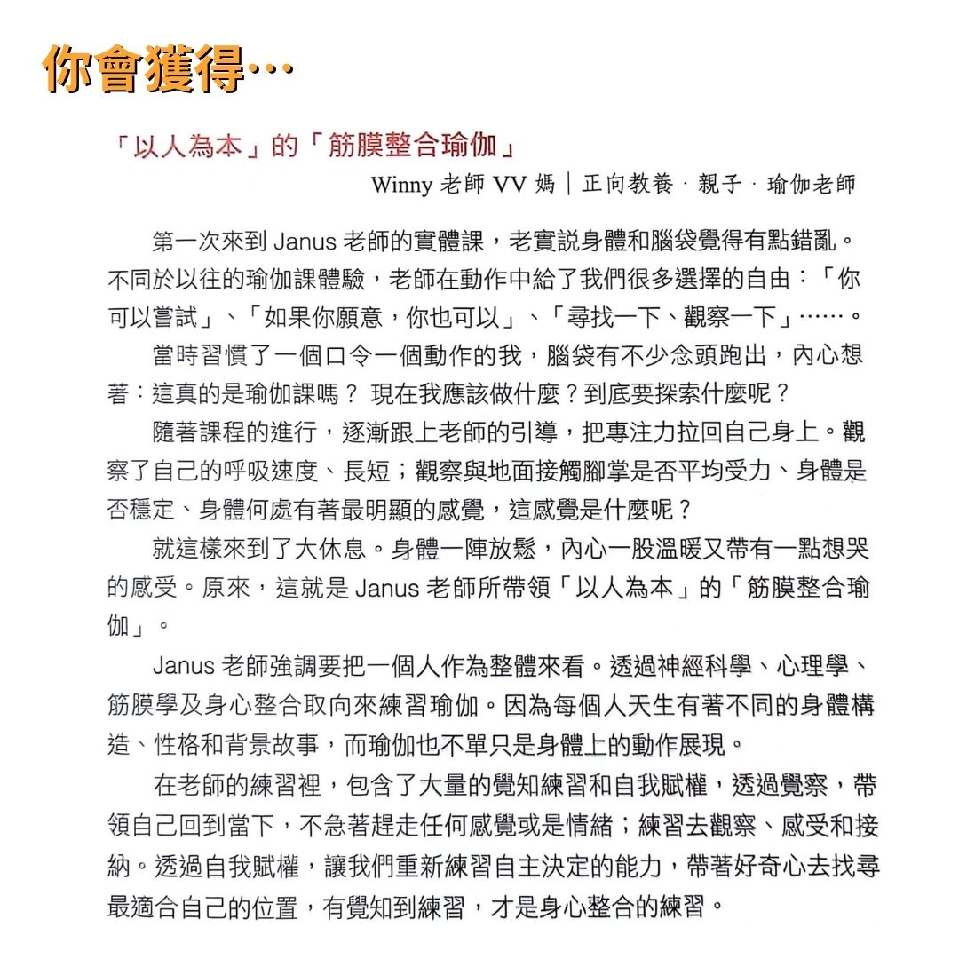 課程中講師也將實際帶領一堂「筋膜整合瑜伽」練習,讓學員體驗如何透過簡易的呼吸及動作練習來促進筋膜健康。課後將提供問答時間,針對學員的提問進行更深入的解說,協助學員打造更適合個人的筋膜保健計畫。