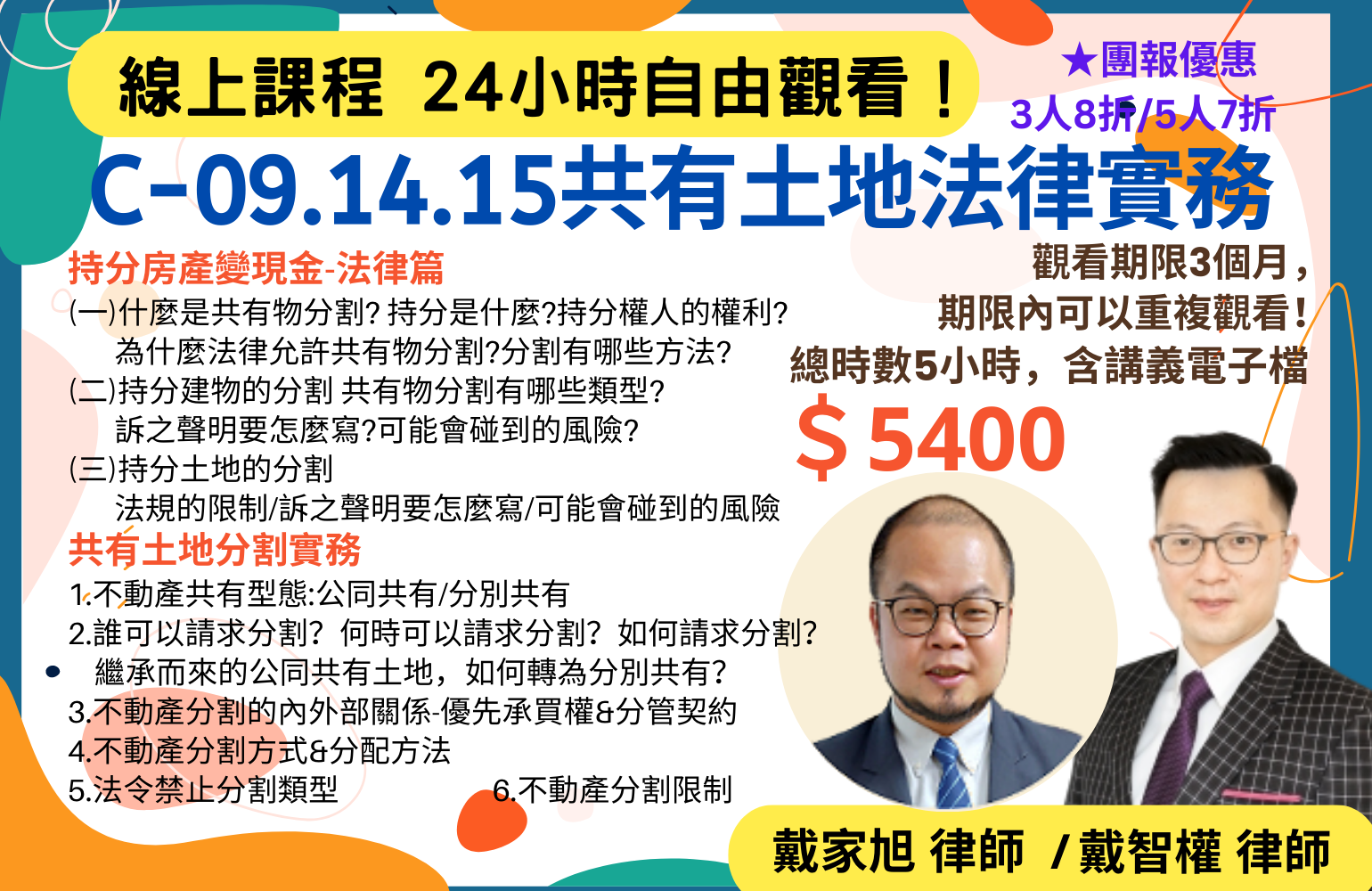 【線上課程】共有土地法律實務班,線上價5400元!完款當天立即開通!