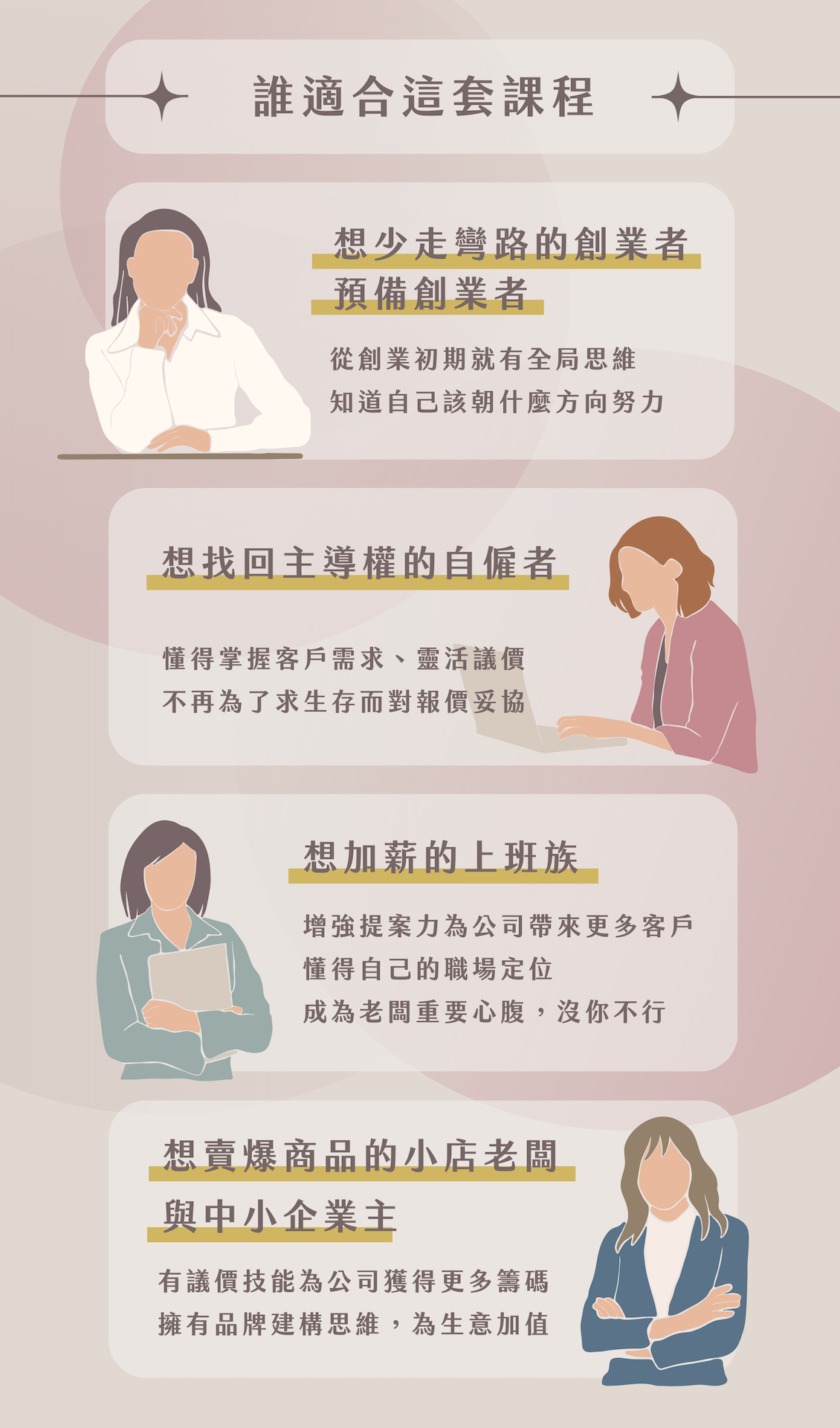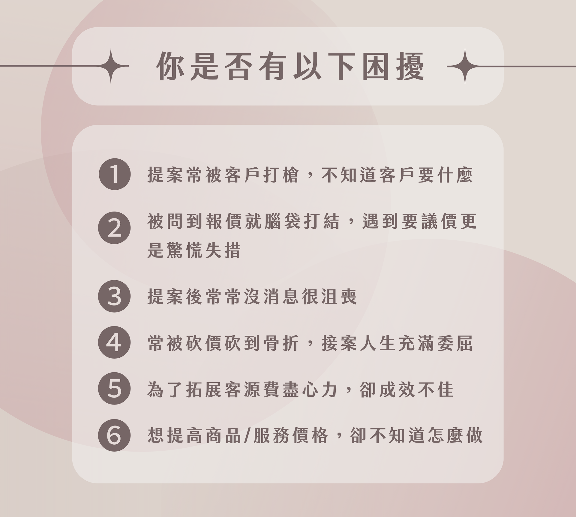 想提高報價、想提升提案通過率,數字背後也許是對於生活的期許,或是不得其門而入的焦急。講師將透過自身經驗,分享她如何從千元專案,2 年內接到破百萬的專案,提案簽約率高達 9 成的秘技大公開。她用自己走過的路,告訴大家即便平凡開局,運用方法也能成功逆襲,輕鬆打怪。