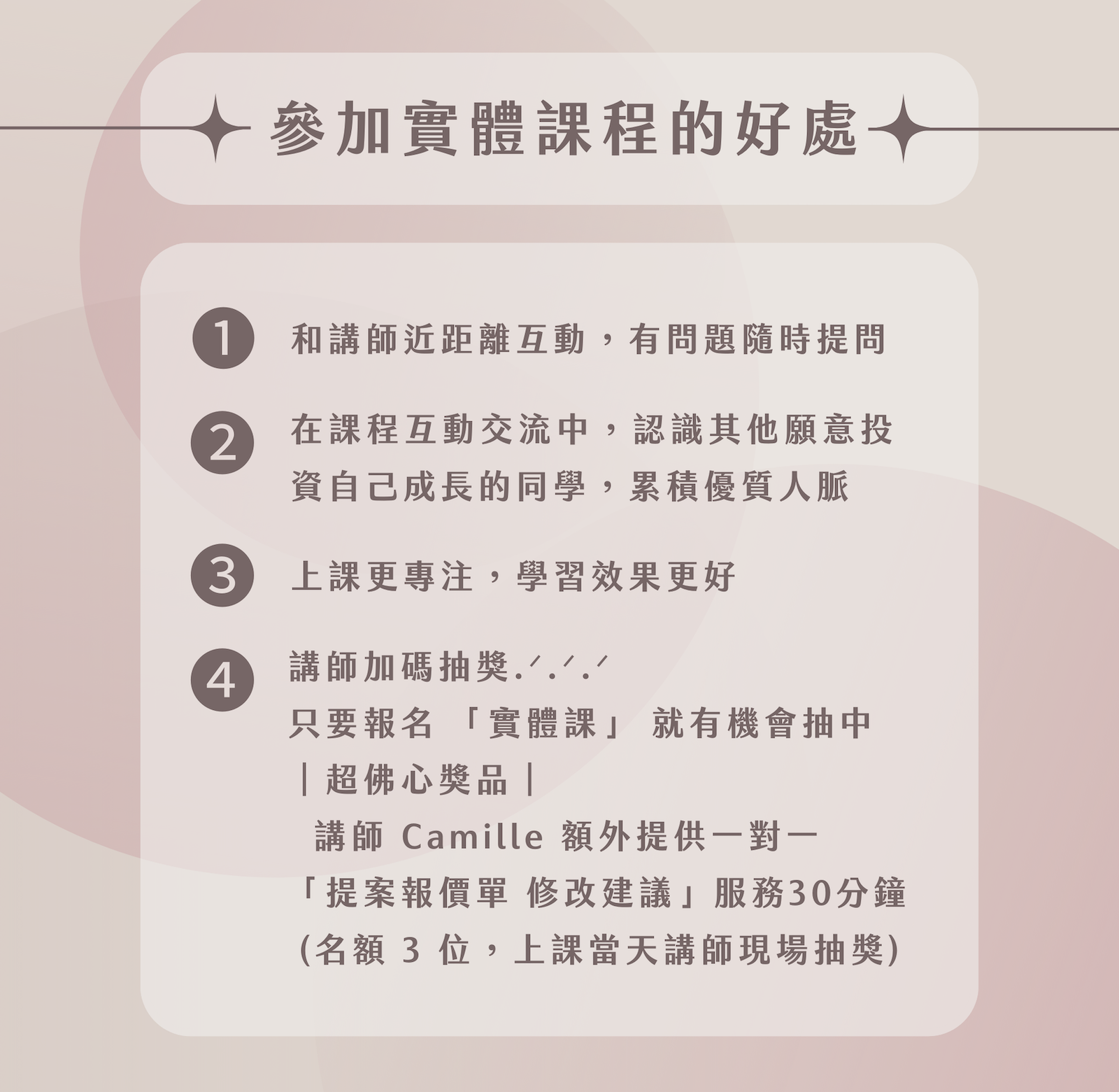 當我們有了經營副業或創業的點子後,最先面臨的挑戰往往是怎麼向別人提案報價,和怎麼把產品或服務行銷出去。很多時候向客戶提案、或賣產品和服務,賣得是一種信任感!而這種信任感的營造是由很多小細節堆疊出來的,Camille將和你分享她累積多年下來的心法。