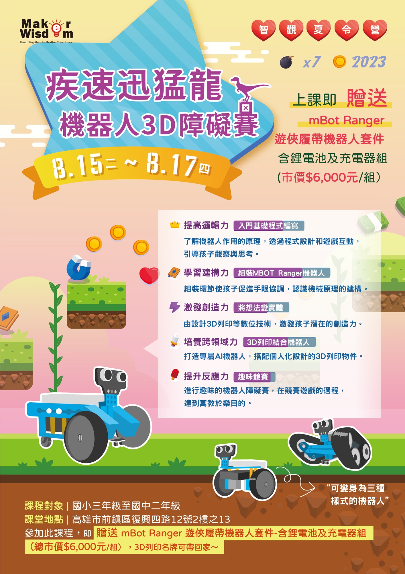 透過動手組裝機器人和學習3D建模軟體設計物件,結合這兩個活動,引導孩子們參加遊戲競賽,並激發他們的「五」力全開。