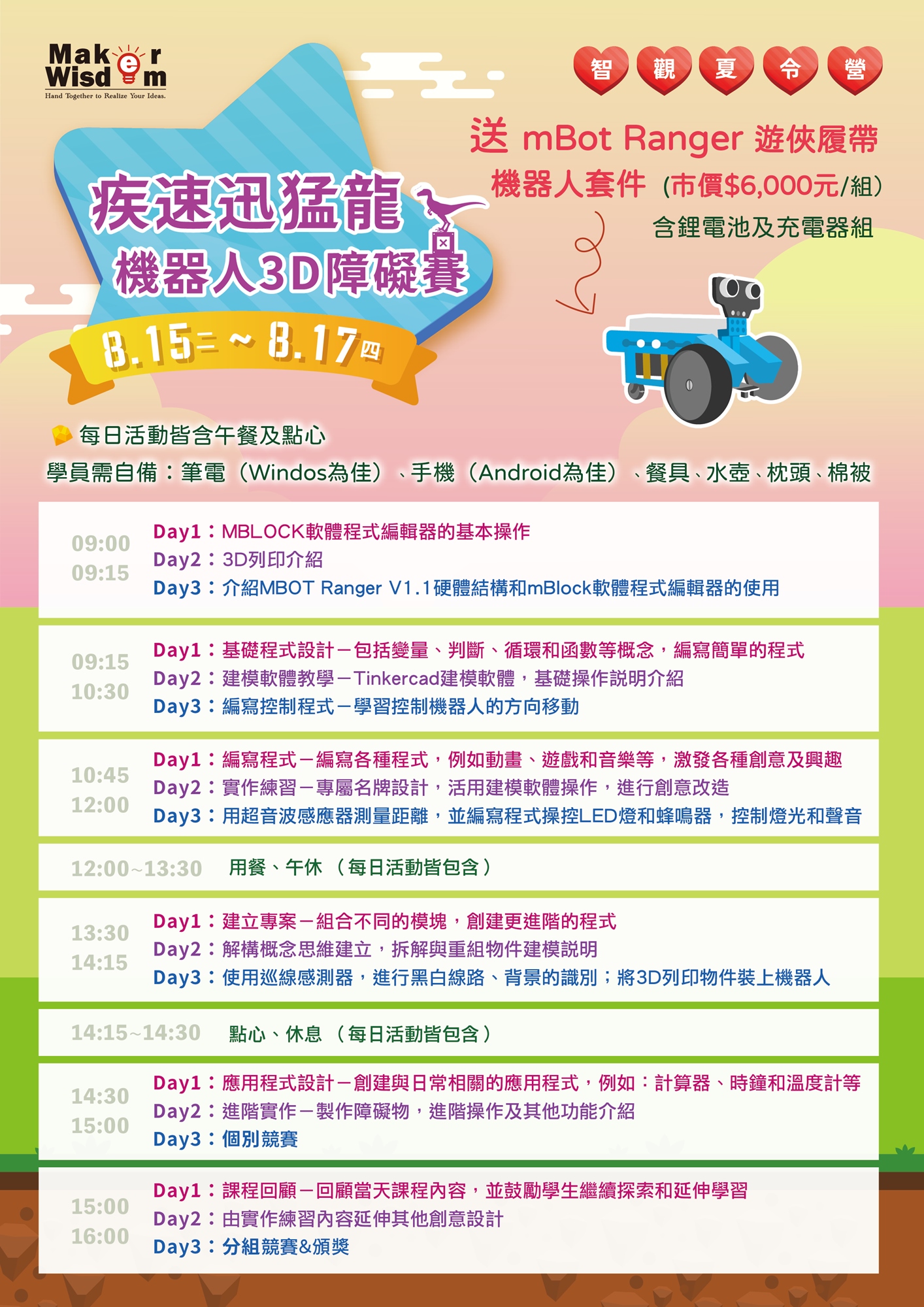 2. 學員需自備:筆電(Windows為佳)、手機(Android為佳)、餐具、水壺、枕頭、棉被