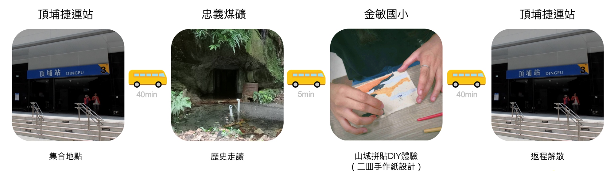 捷運頂埔站(集合地點)→忠義煤礦→金敏國小→返程至捷運頂埔站