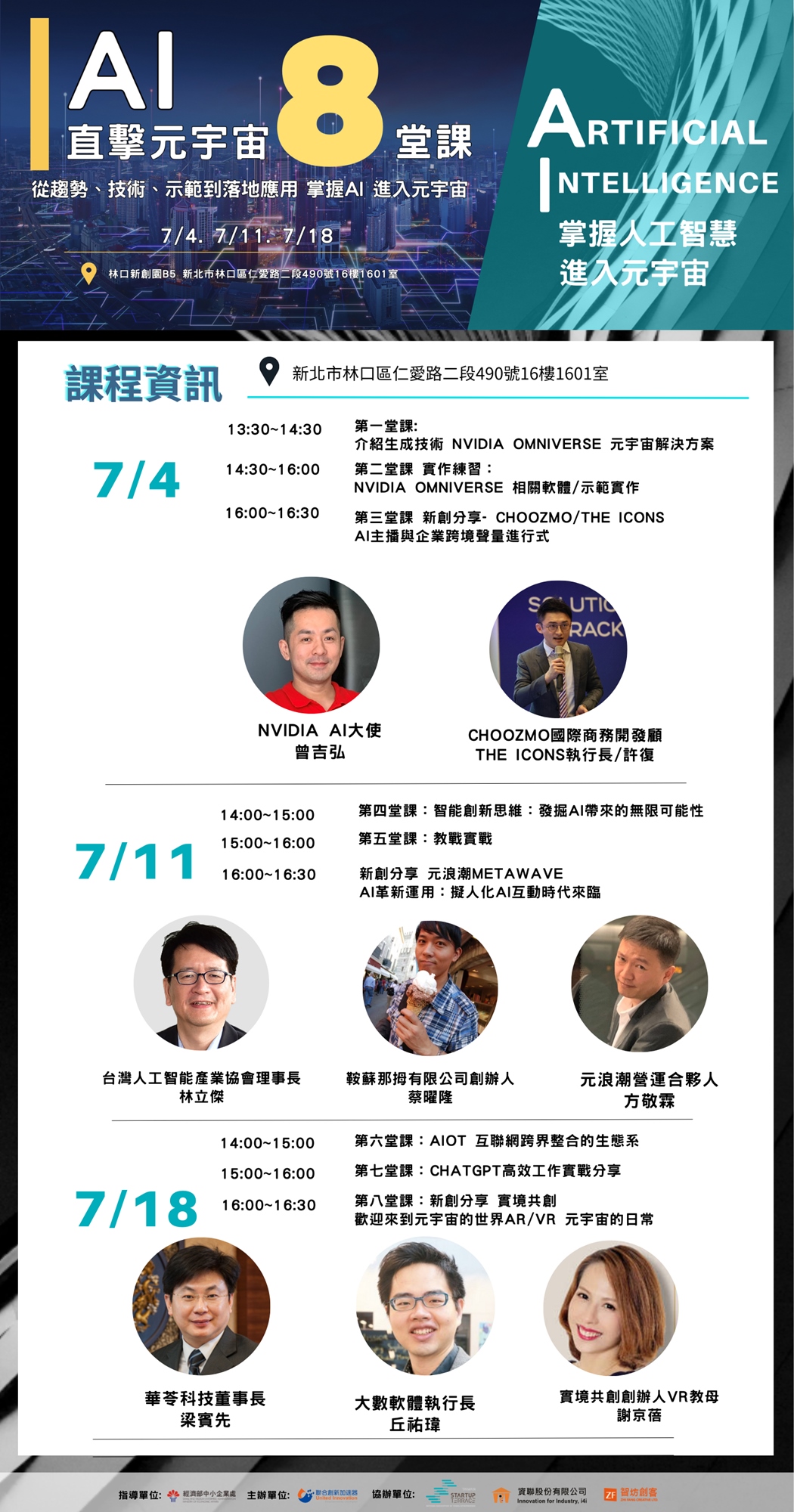 「直擊元宇宙的八堂課」課程邀請NVIDIA的科學家、AI 校園Ambassador 曾吉弘剖析人工智慧、生成技術、NVIDIA Omniverse 數位轉型解決方案;面對食衣住行娛樂百工百業難以估計的龐大市場,華苓科技董事長梁賓先從物聯網生態系,講授如何跨界整合這些等著變革創新的產業,分享實際應用案例;VR教母謝京蓓漫談元宇宙的發展與應用,當然還有最新的ChatGPT,如何用人工智慧來幫助提升高效率工作實戰與練習。直擊元宇宙八堂課以科技應用為支撐,內容精實飽滿,趕快報名,和我們一起奔跑前行。