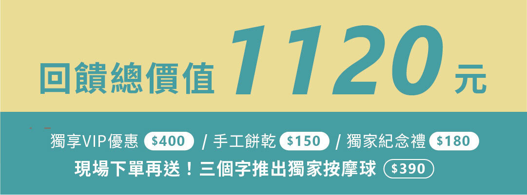 ● 活動贈禮:現場提供獨享優惠折扣400元、價值330元的下午茶與紀念禮,現場下單再送「三個字獨家按摩球」