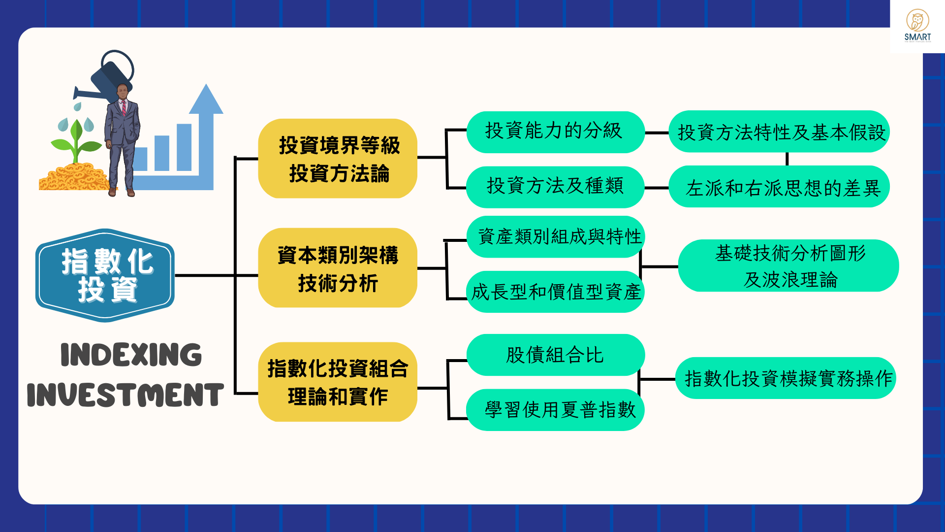 想進投資市場替自己創造一份理財收入,這堂課可以讓你先了解指數化投資,建立自己的投資組合,並學習最適合自己的投資方法,讓你安穩睡得著覺,睡得著很重要。