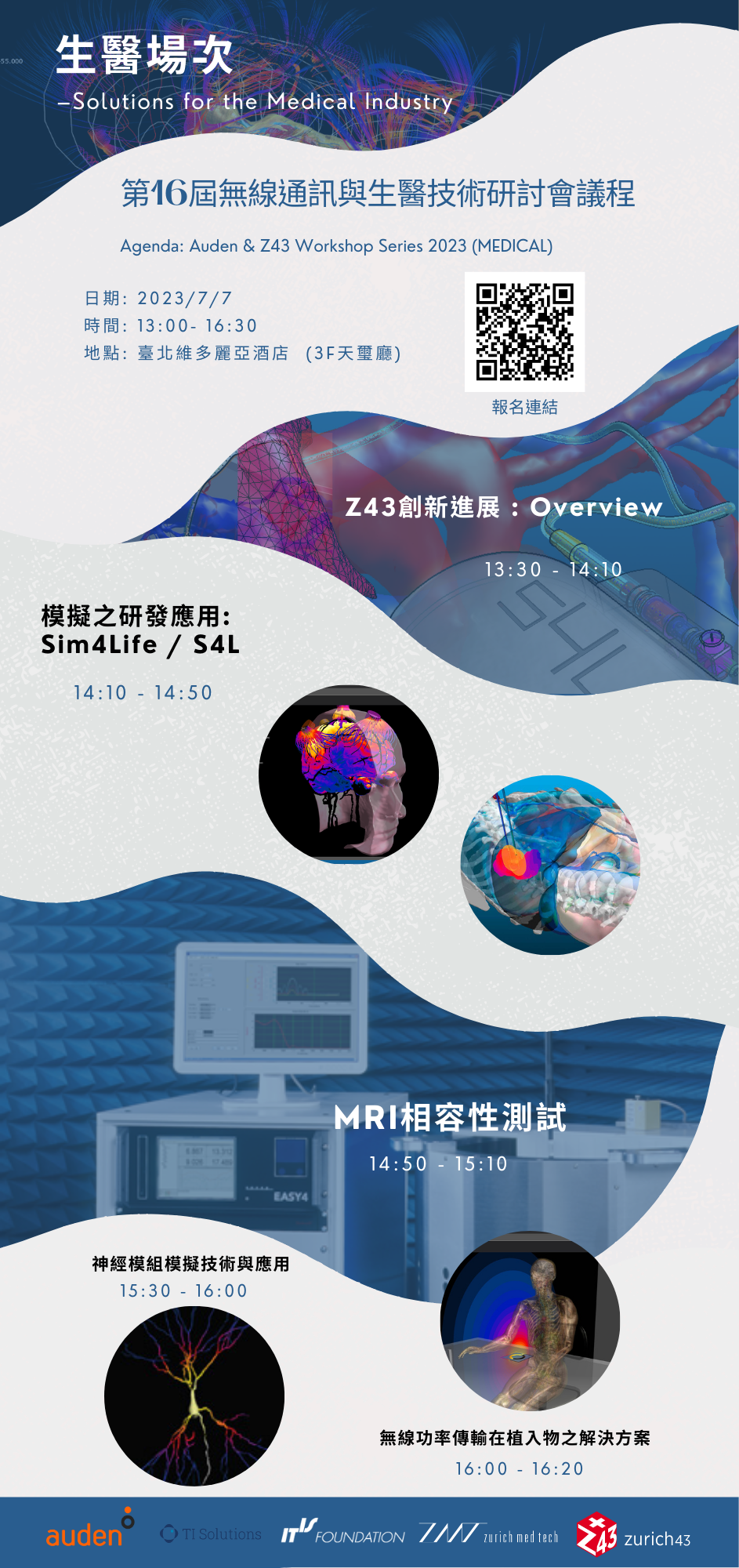 生醫場次將介紹計算生命科學平台Sim4Life的最新發展,以及MRI/植入物安全性評估量測方面的最新成果。此外,結合時域干涉技術(Temporal Interference)和神經刺激的應用,TI Solution AG今年推出了一個深層腦部區域的神經刺激設備,幫助神經科學家和腦刺激專家快速、安全且有效的建立醫療方案。
