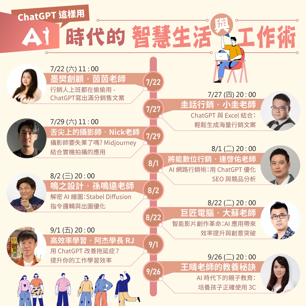 • 講座以直播方式進行,讓同學在安靜舒適的環境上線,將會於上課前1小時使用電子信箱寄出上課連結。