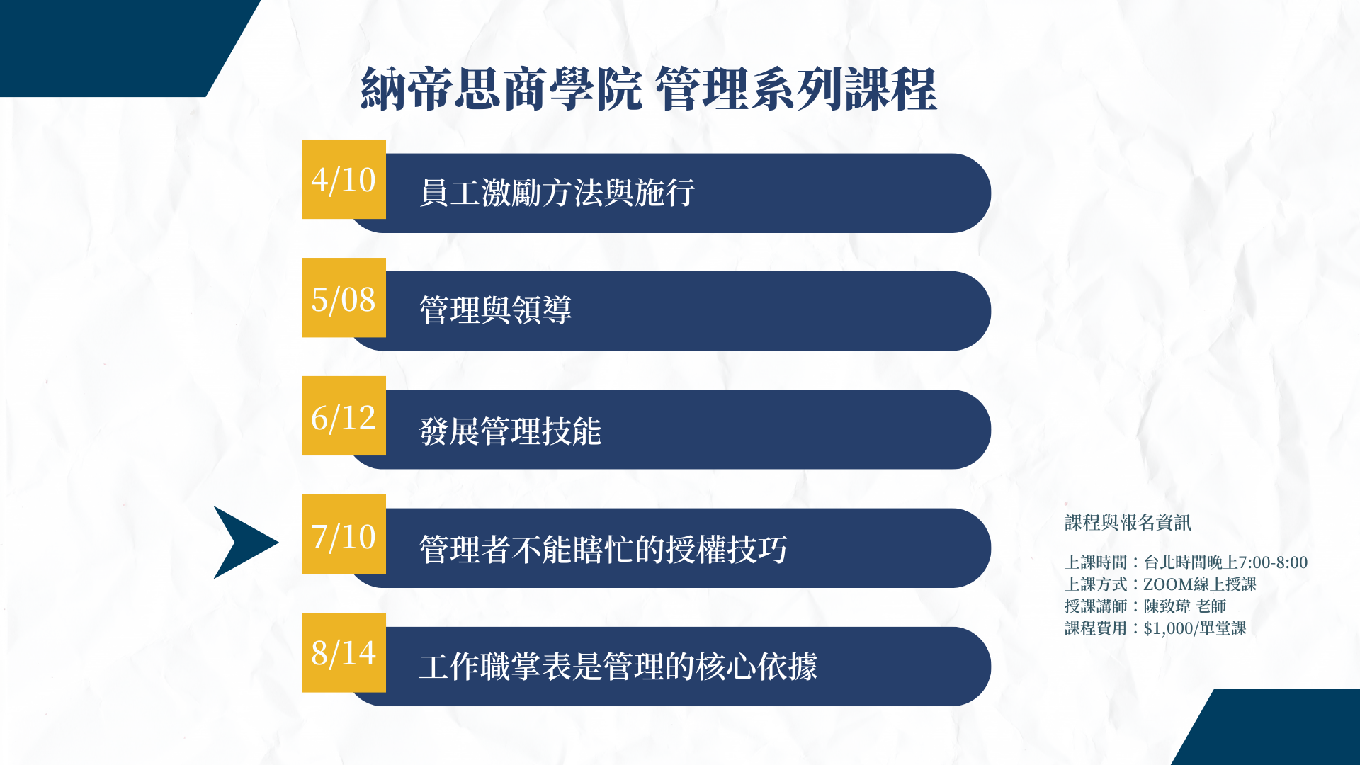 納帝思商學院中,有致瑋老師帶著大家繼續深入和提升。在這個自我進修時代中,持續投資自己的核心專業,是每一個人相當值得的選擇。