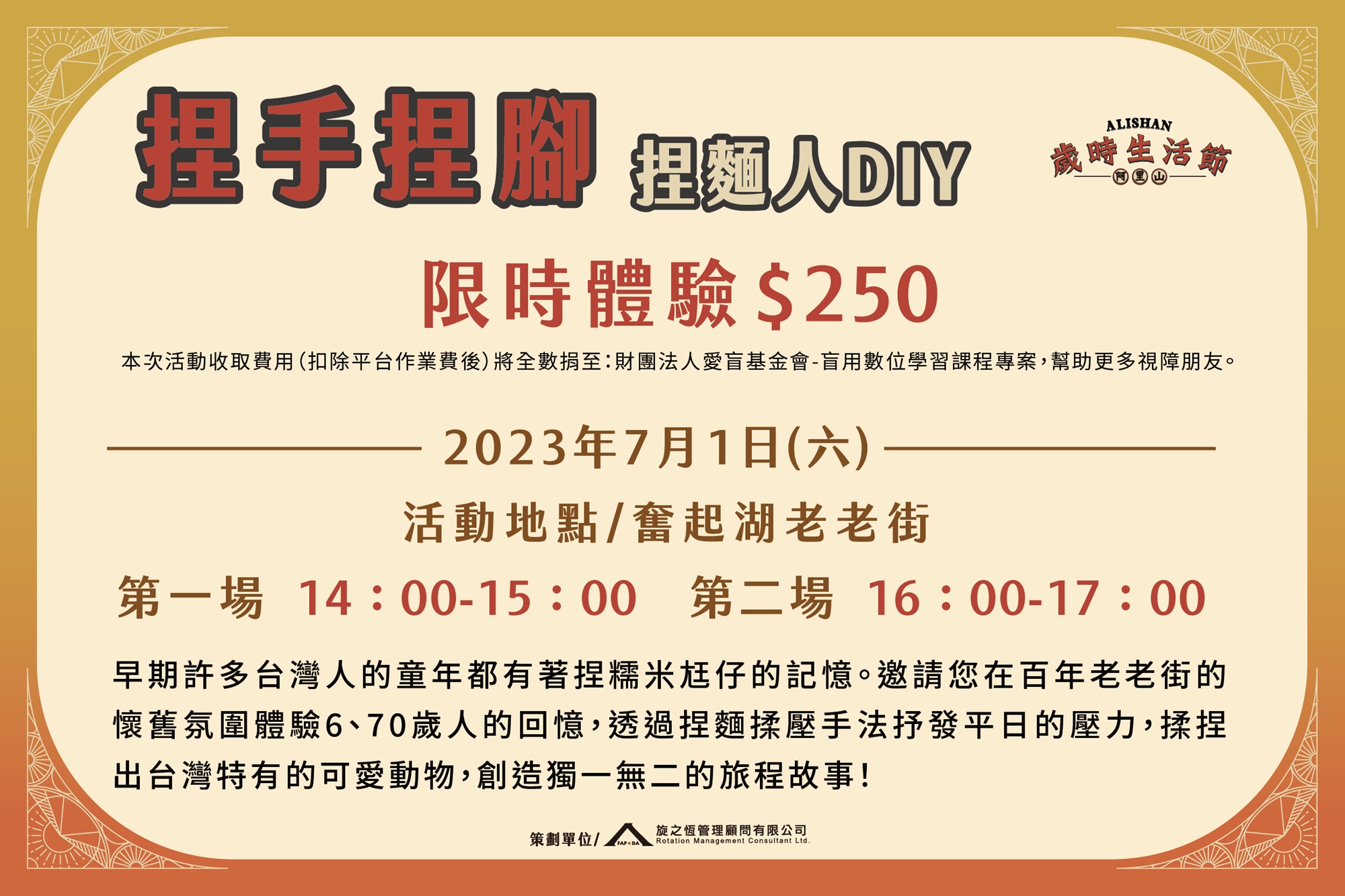 - 活動時間:2023年07月01日(六),場次一:14:00-15:00、場次二:16:00-17:00(活動前30分鐘開始報到)